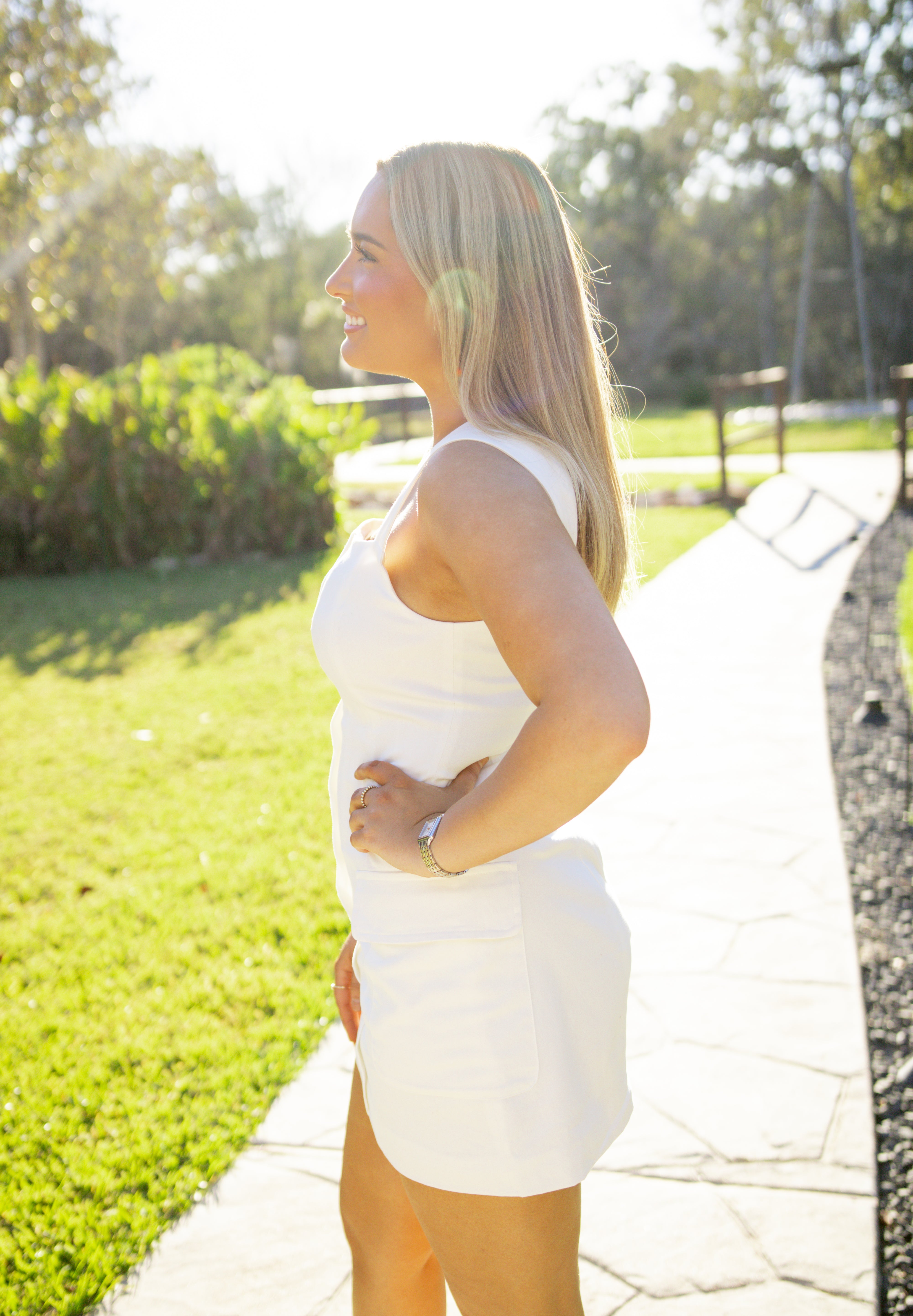 Meet your new go-to dress: the Poplin Pocket Mini in crisp off-white. This playful piece pairs polished sophistication with everyday charm, featuring a nipped waist that flows into a gently flared skirt for a flattering silhouette. The sleeveless top is anchored by an adorable adjustable tie at the back, while two fold-over flap pockets add utility-chic flair to the front thighs. Whether you're dressing it up with heels for evening or keeping it casual with sandals, this mini dress delivers effortless style that works as hard as you do.