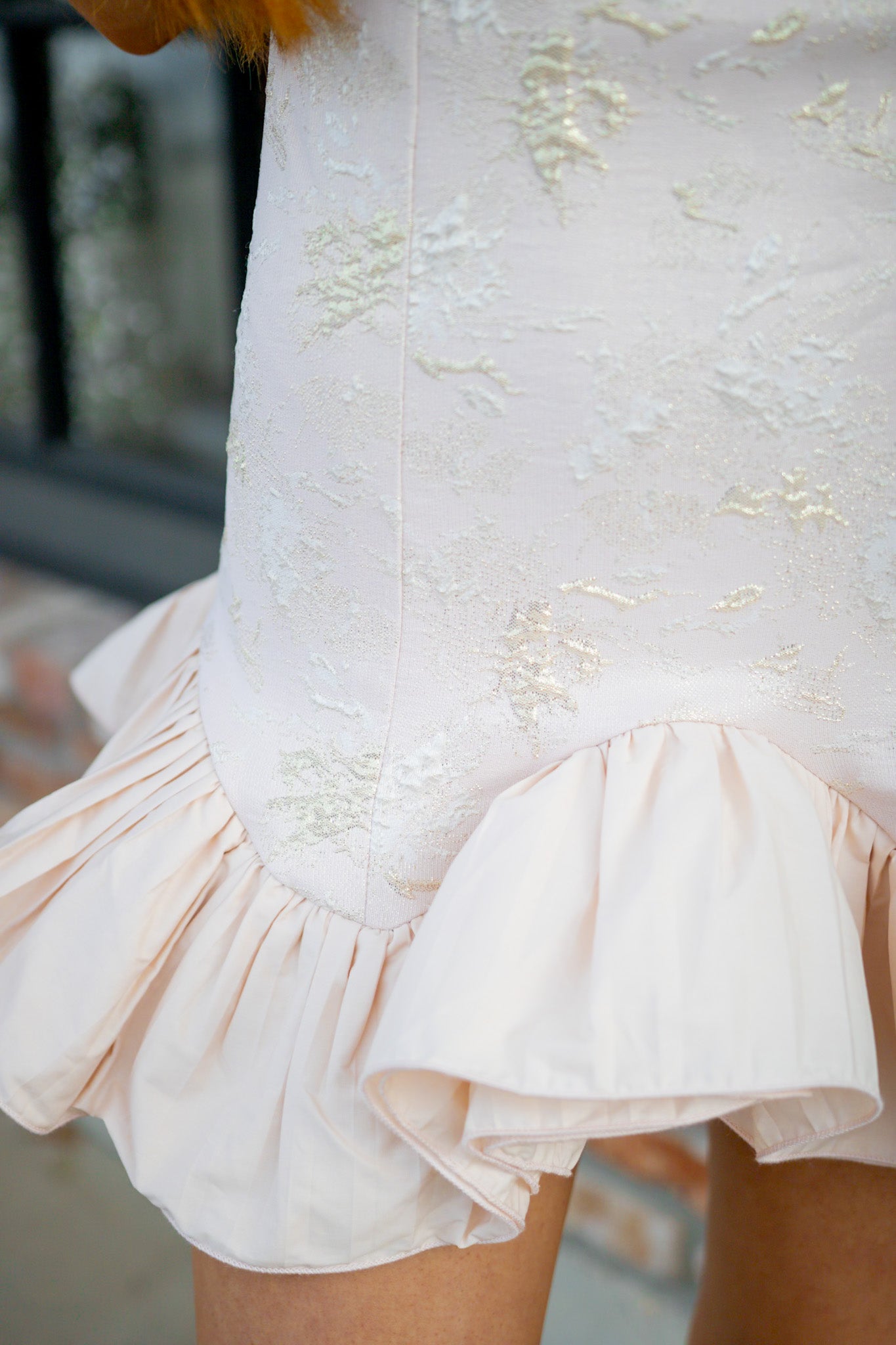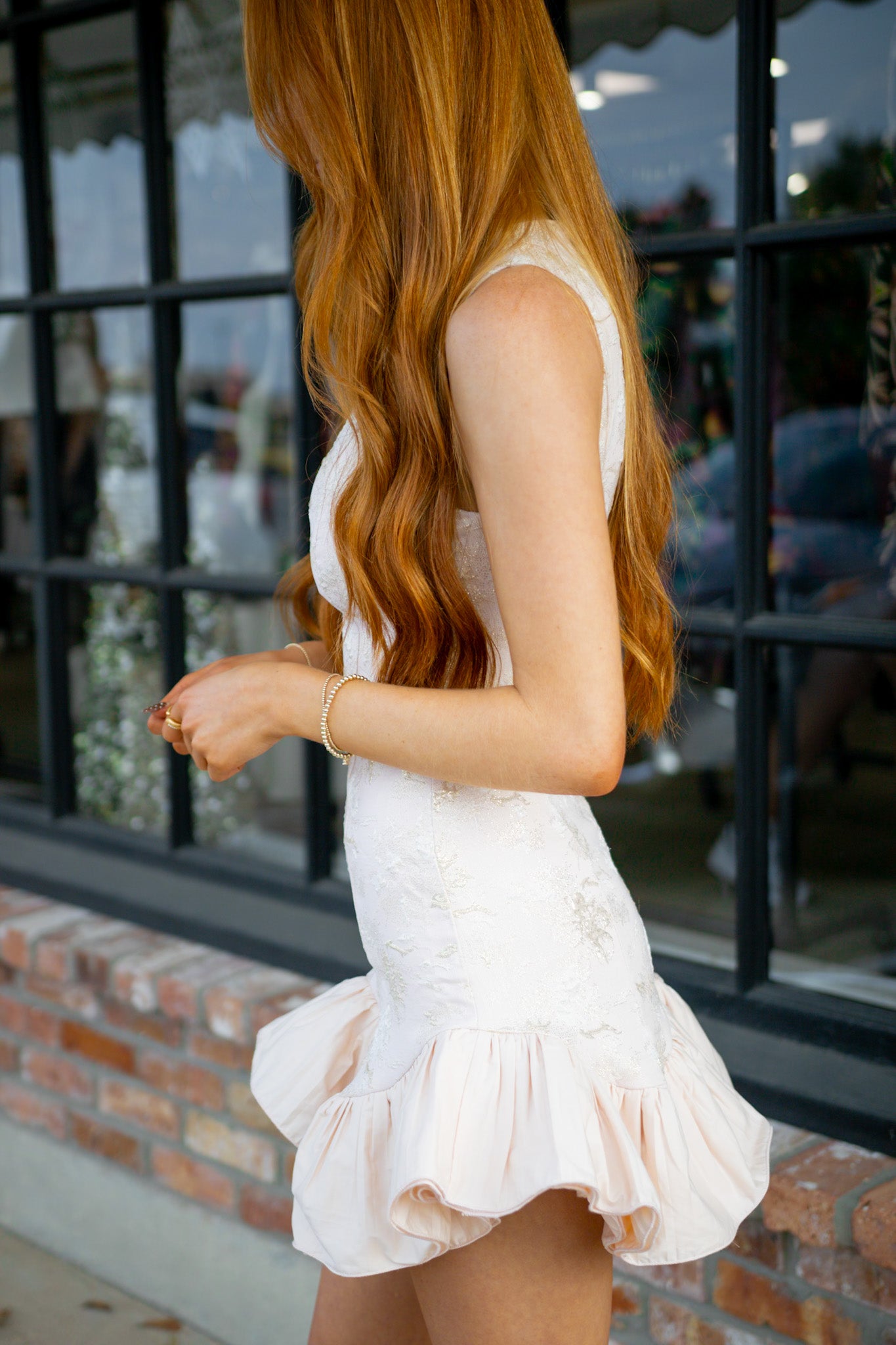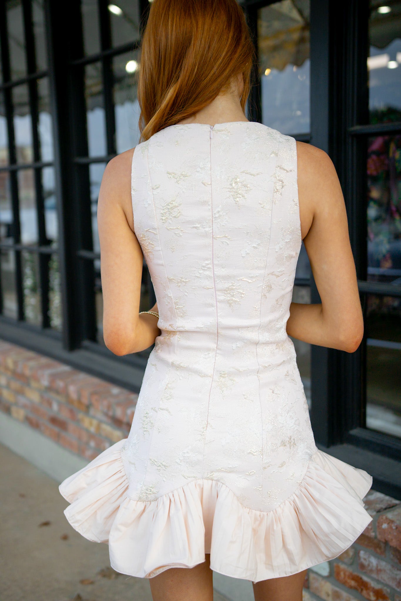 Twirl into the spotlight in this enchanting sleeveless mini dress, where delicate jacquard patterns meet a fluttery ruffle hem that dances with every step. The blush tone brings a soft, romantic touch perfect for date nights or special occasions. Designed to make you feel like the star of the show, this playful piece combines feminine details with effortless elegance. Slip it on and let the ruffles do the talking.