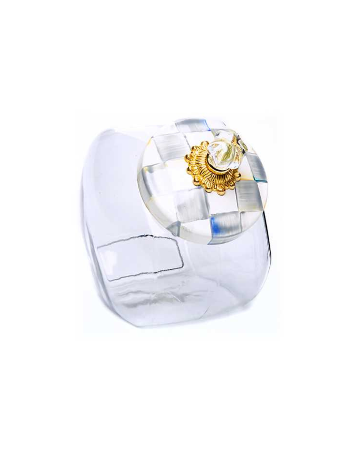Glass jar; lid has heavy-gauge, hand-glazed steel underbody with hand-painted Sterling Checks. Topped with a glass knob and brass hardware. Pieces may vary due to the handmade nature of each product.