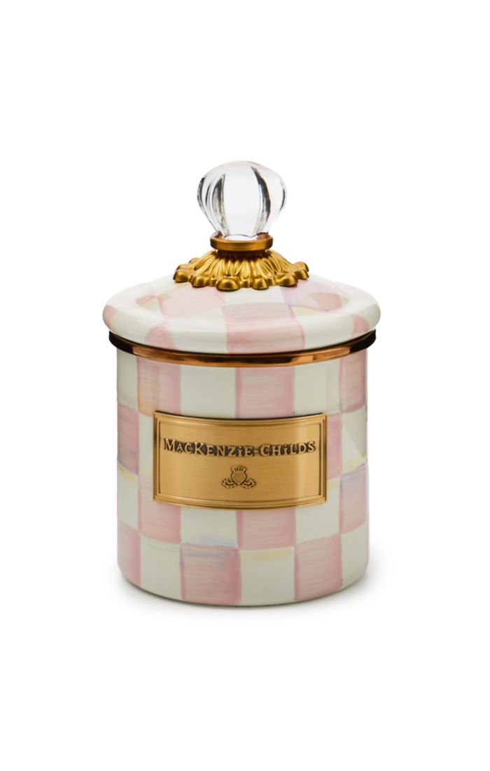 Heavy-gauge, hand-glazed steel underbody with hand-painted Rosy Checks, rimmed in bronzed stainless steel. Brass and glass accents. Silicone seal inside lid. Pieces may vary due to the handmade nature of each product. Imported.