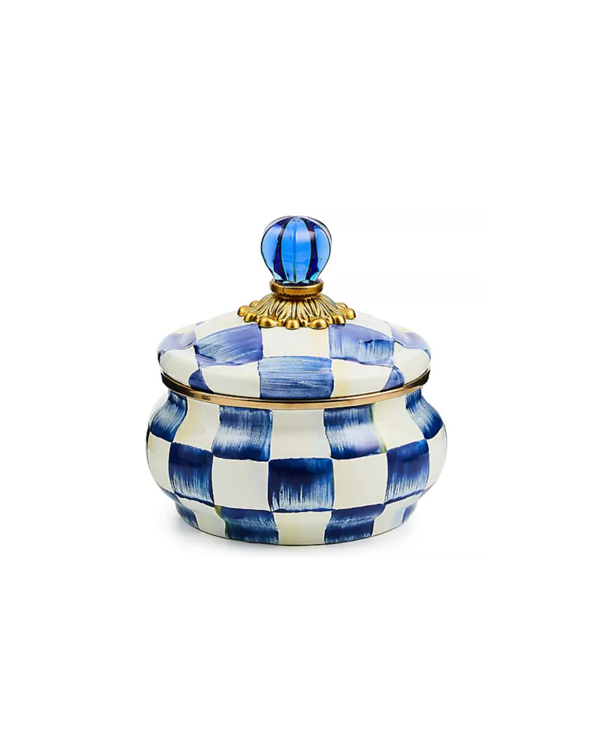 The Royal Check Squashed Pot more than pulls its weight, because this chubby silhouette holds an impressive 20 ounces. Its heavy-gauge steel underbody is color-glazed, hand-painted with color-dragged checks in a range of blue hues, rimmed in bronzed stainless steel, and topped with an elegant blue glass knob. Each piece of Royal Check reflects the artisan’s hand, so no two are exactly alike, although they all work together in perfect harmony.