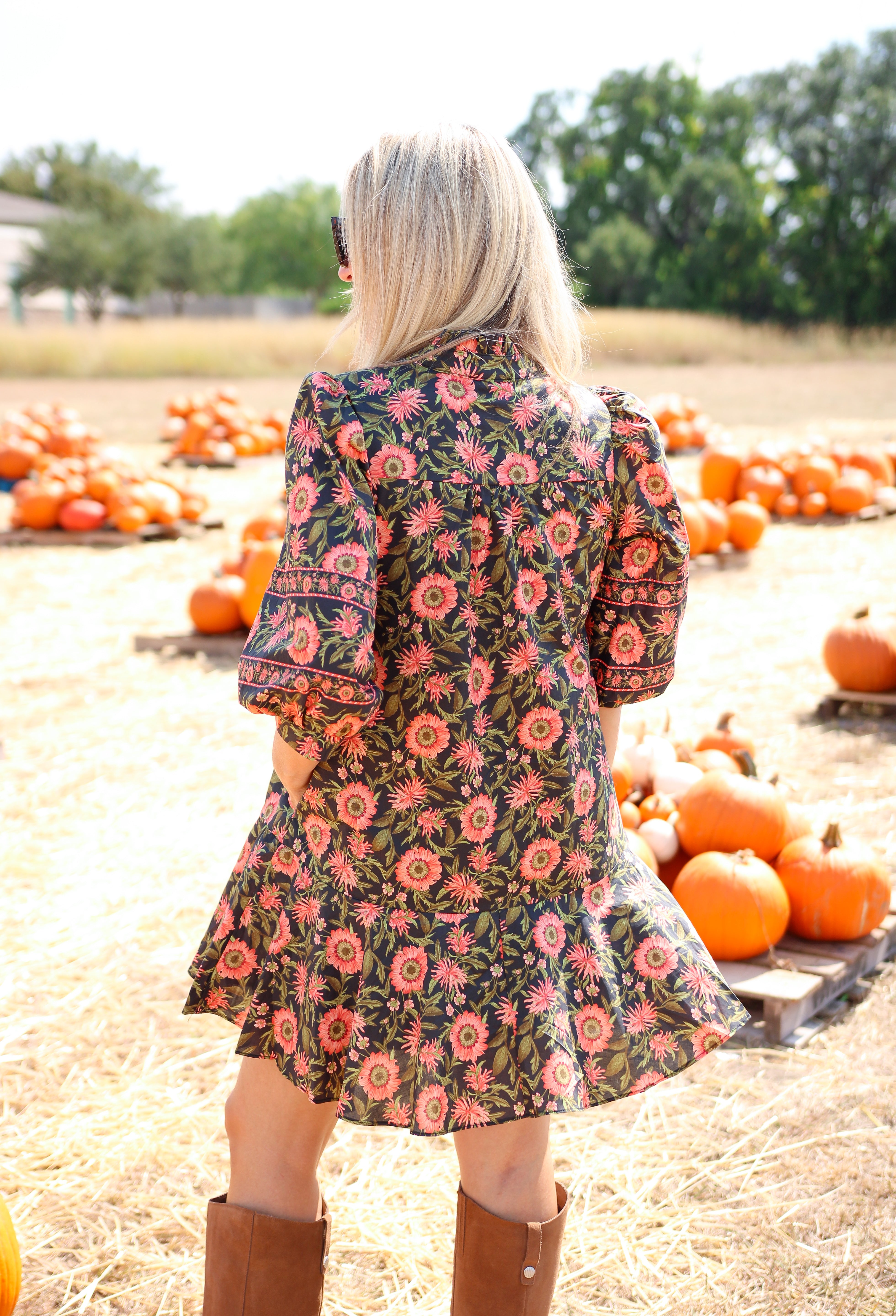 Step into charm with the Down Memory Lane Dress in black, boasting a lively floral print and playful puffed 3/4 sleeves. The ruffled neck band collar and partial button front add flirty details, while handy side pockets keep small essentials close. Lightweight and lined, this woven mini dress is perfect for twirling through sunny days with effortless style.
