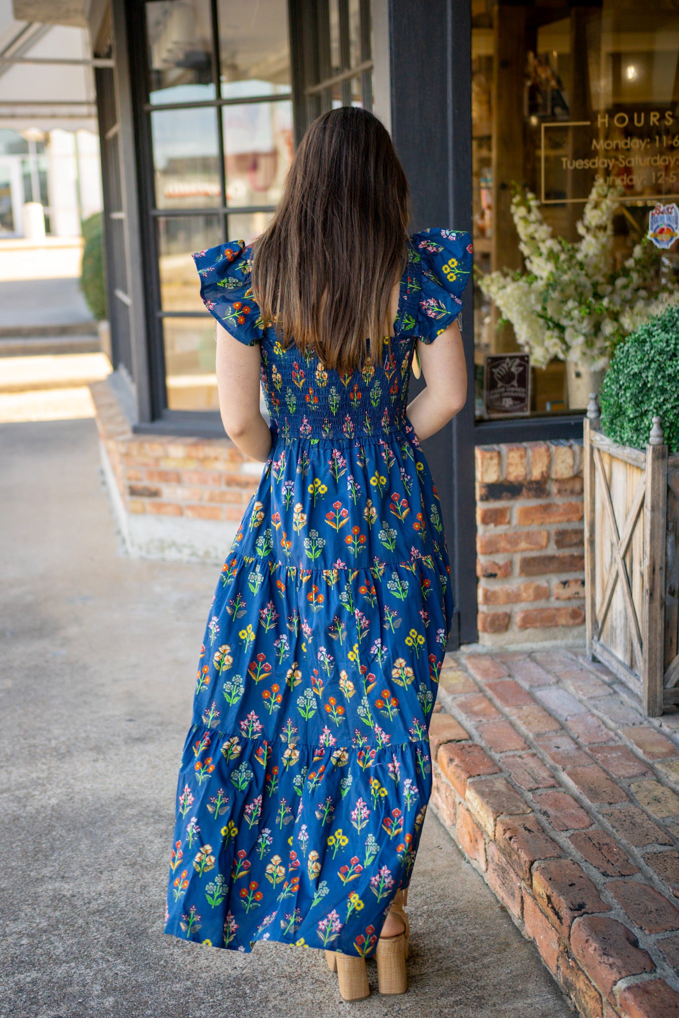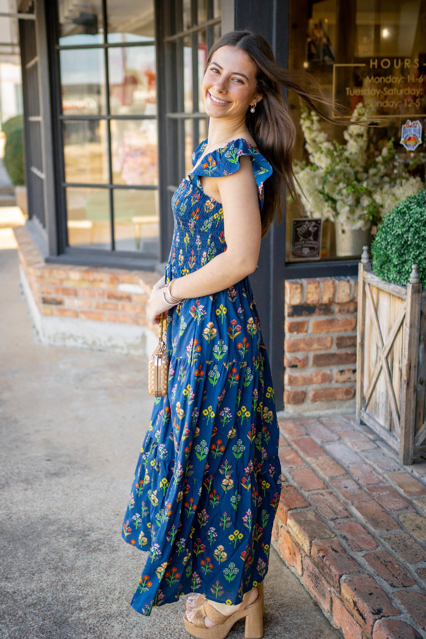 Twirl into effortless elegance with this navy midi dress, where delicate floral blooms dance across a smocked bodice that cinches just right. The partially lined silhouette keeps things breezy, while hidden side pockets add a practical touch for your essentials. Perfect for garden parties, weekend brunch, or whenever you want to feel like the main character in your own story.