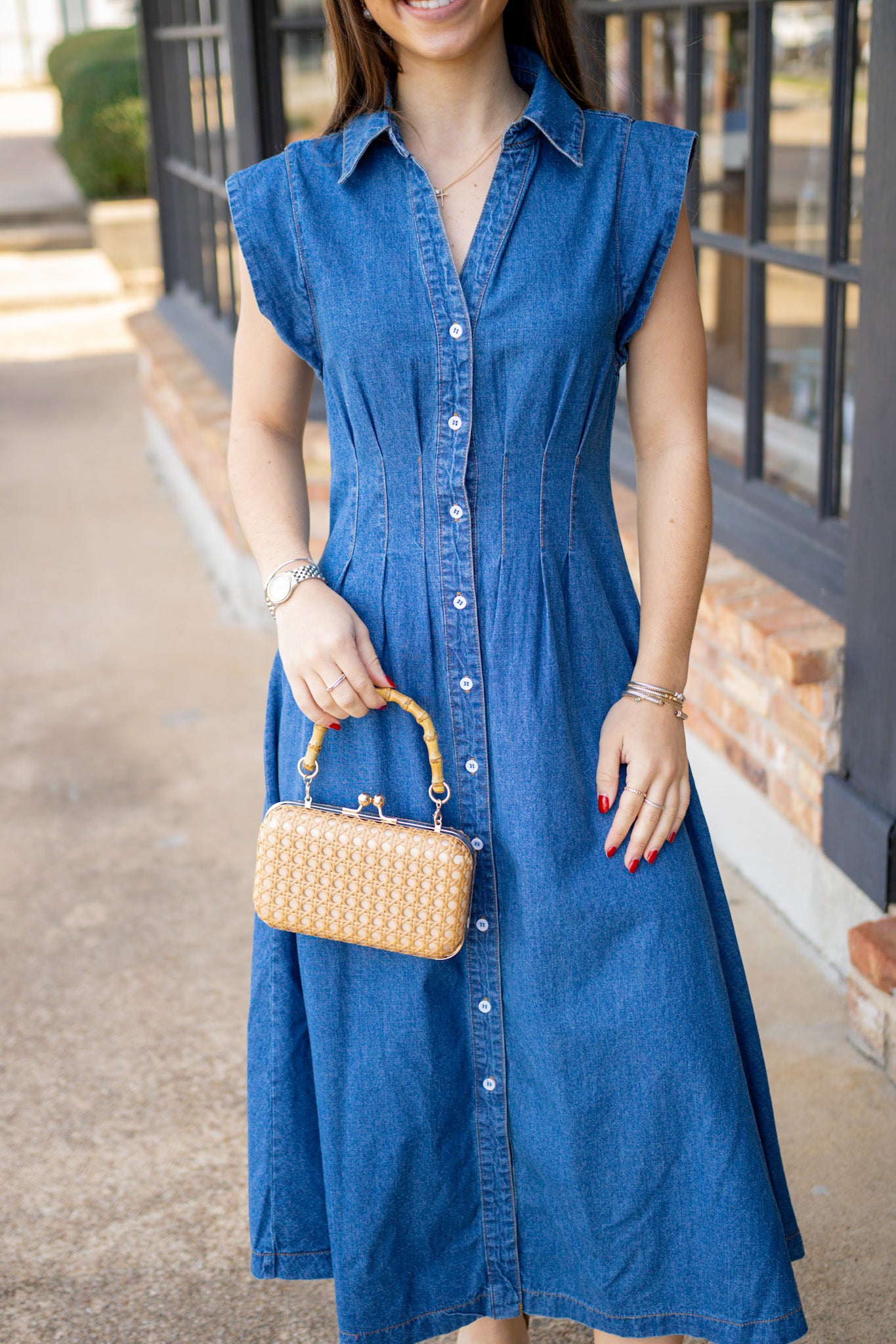 Introducing your new denim obsession! This midi dress is giving main character energy with its full-length button-up front, crisp collar, and adorable cropped sleeves. But here's the real star: that cleverly tapered waistline designed to cinch and flatter your curves just right. Dress it up with heels and jewelry or keep it casual with sneakers—this versatile piece works for literally everything. Denim done right, denim done fun.