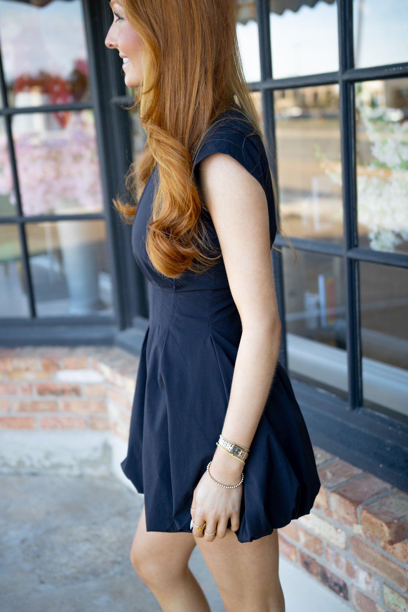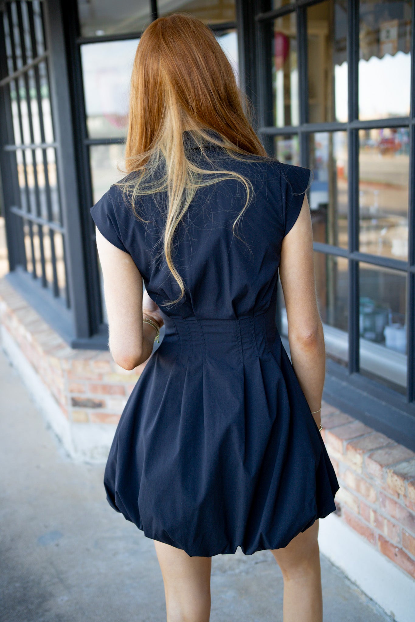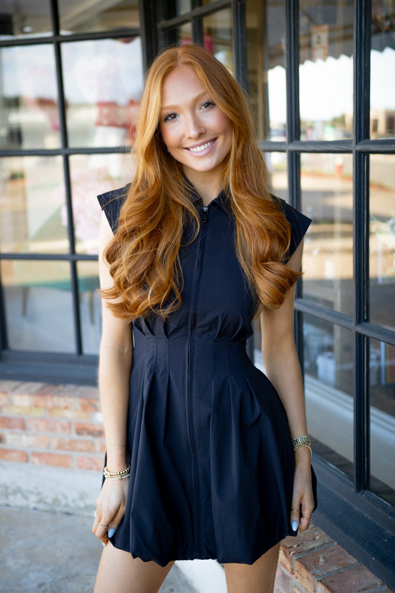 Introducing the Dyanne Dress - a charming full zip front closure dress with a playful bubble hem and sleek black color. The collared neckline and short sleeves add a touch of sophistication, while the pintuck waist details offer a flattering fit. Perfect for dressing up or down with ease.