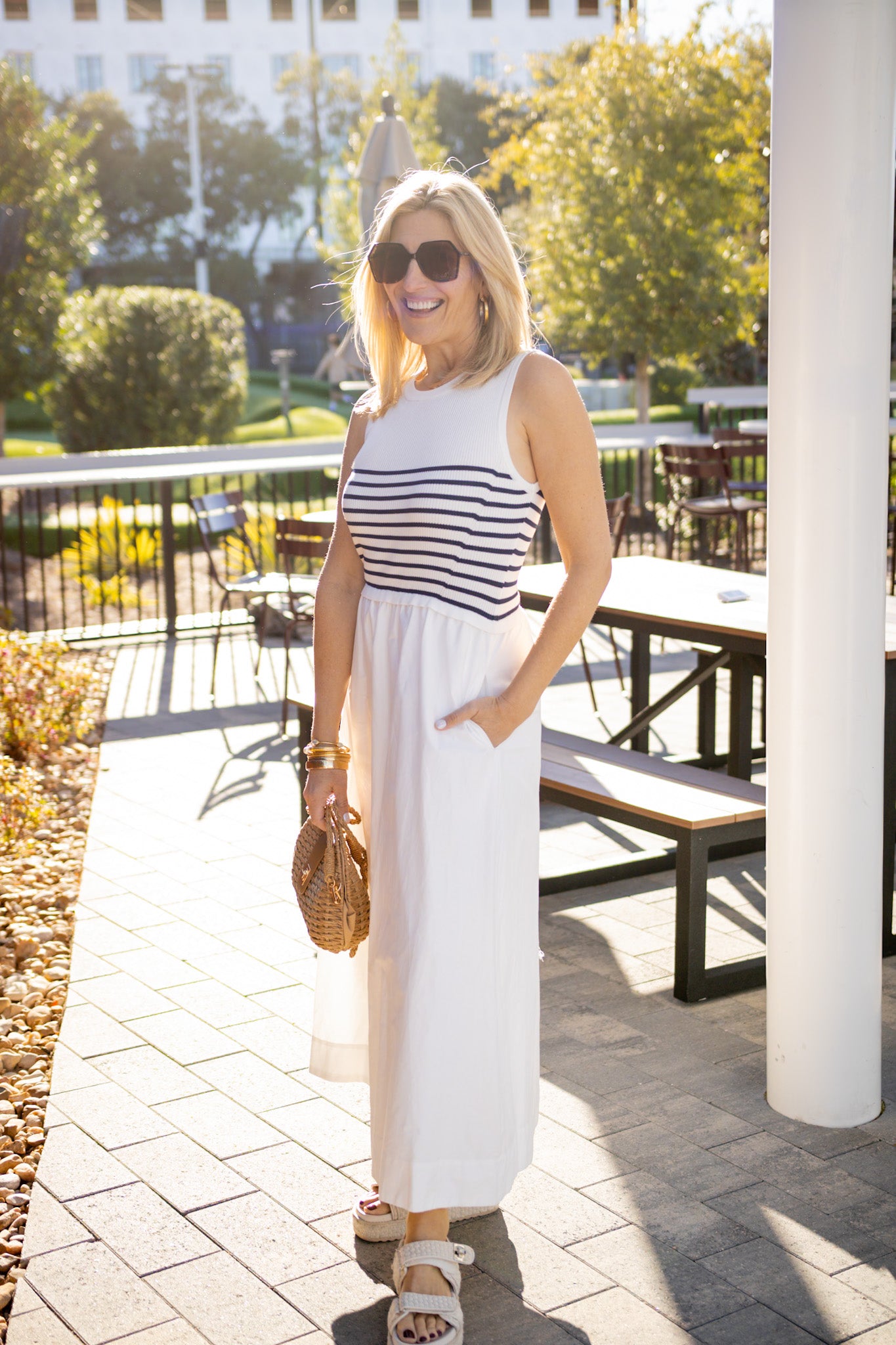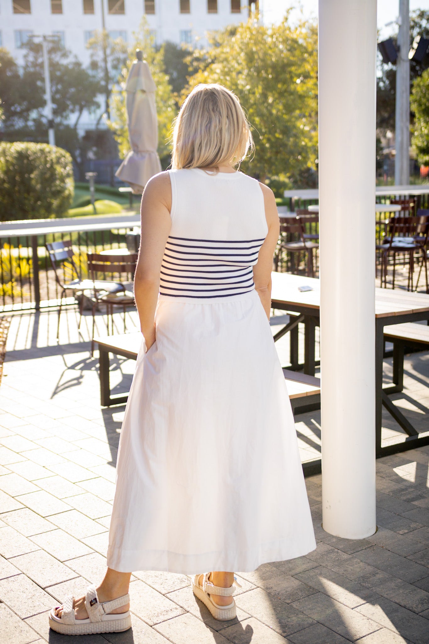 Sleek and versatile, this midi tank dress masters the art of mixed textures with its knit-to-woven construction. The crisp white and navy stripes deliver timeless appeal while the relaxed silhouette keeps things effortlessly cool. Transition from brunch to dinner with ease—slip on flats for laid-back vibes or elevate with heels and your favorite statement pieces. A wardrobe essential that works as hard as you do.