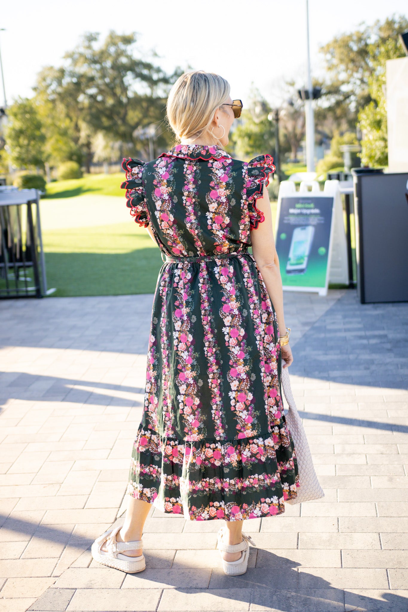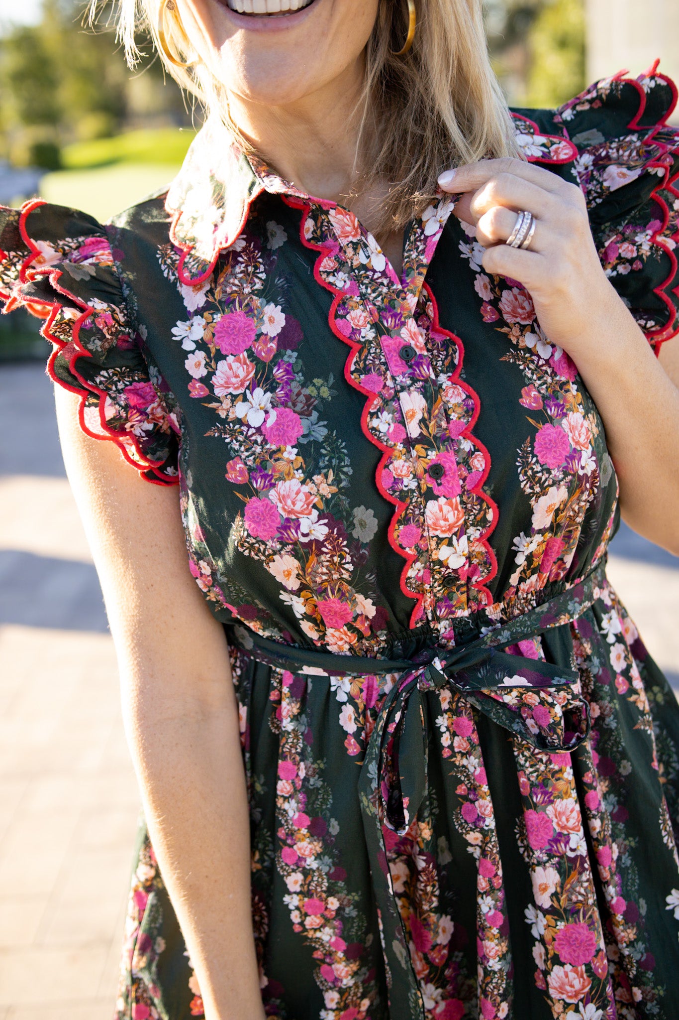 Step into a storybook garden with this enchanting midi dress. Draped in a deep forest green adorned with lush peonies and wildflowers, it's brought to life by striking crimson scalloped embroidery that dances along the collar, button-down front, and flutter sleeves. The cinched waist and matching tie-belt create a flattering silhouette that celebrates your curves, while tiered floral stripes add whimsical vintage charm. Perfect for everything from a sunshine brunch to an elegant garden celebration, this dress proves that playful style never goes out of season.