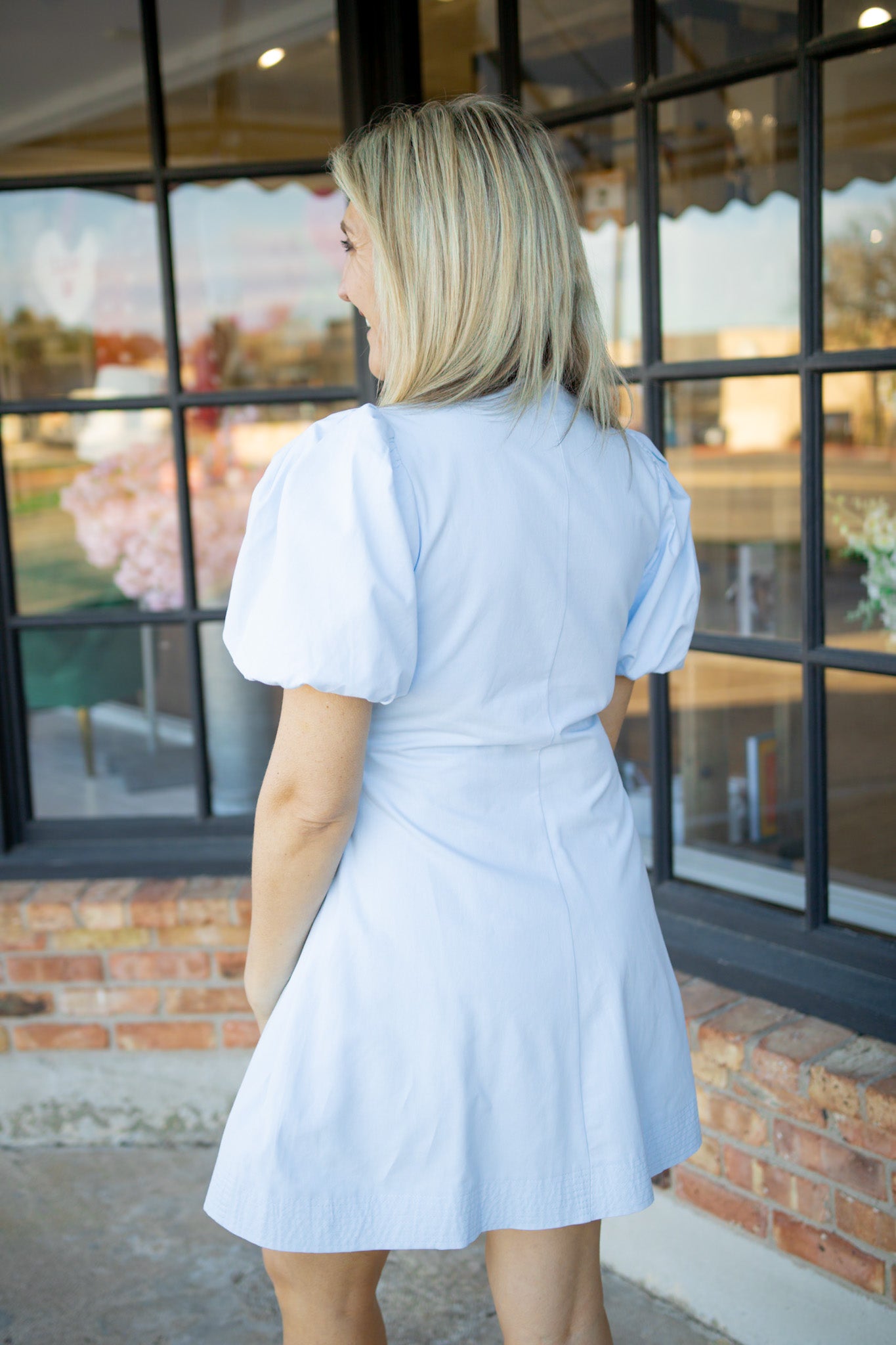 Make a statement with the Market Day Mini Dress in soft baby blue. This playful piece features dramatic puff sleeves that command attention, paired with a fitted bodice and flattering A-line skirt. The round neckline and front button-down closure with coordinating covered buttons add charming detail, while subtle front pleats create movement and dimension. Perfect for brunch dates, garden parties, or whenever you want to turn heads with effortless style.