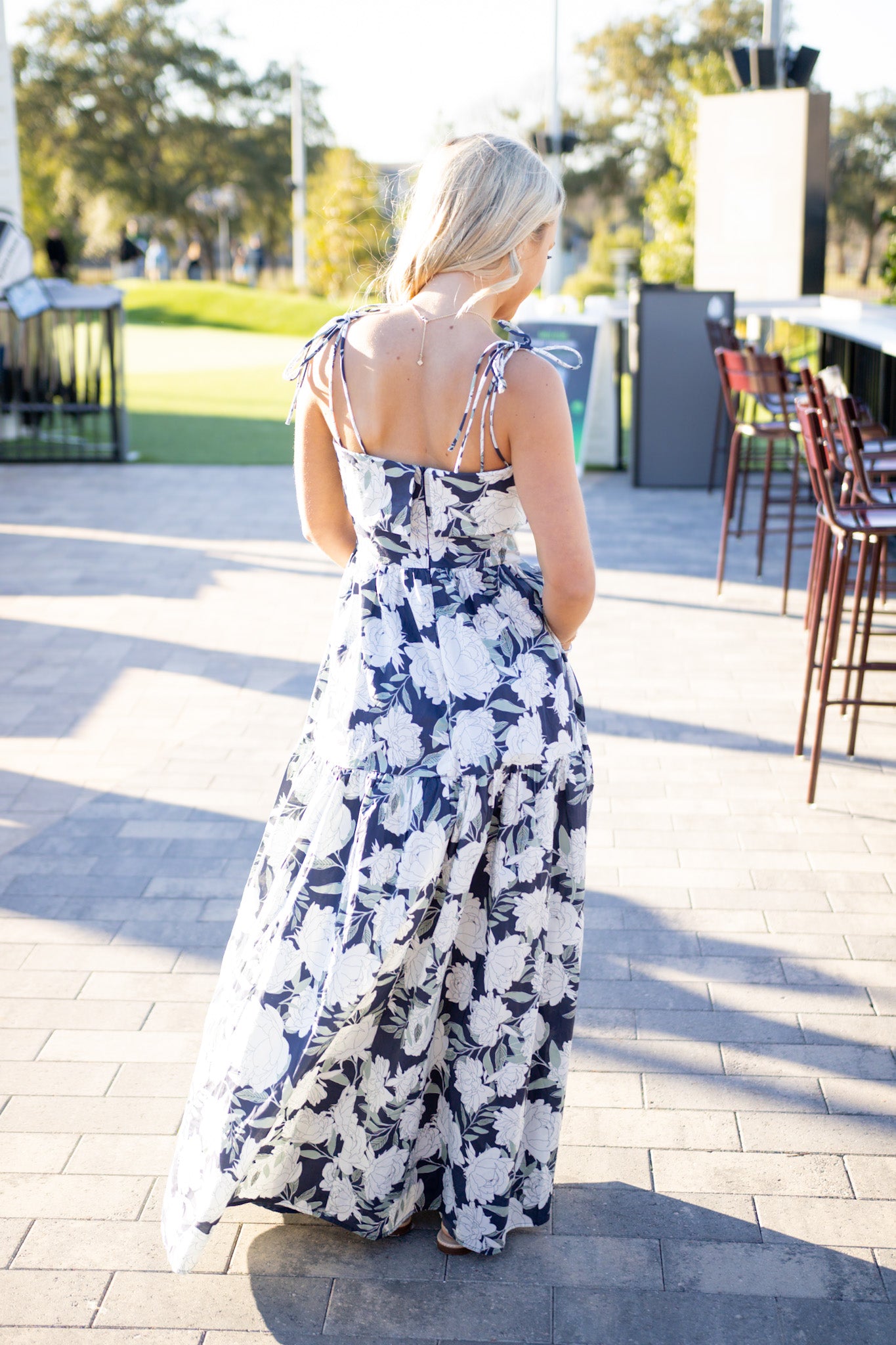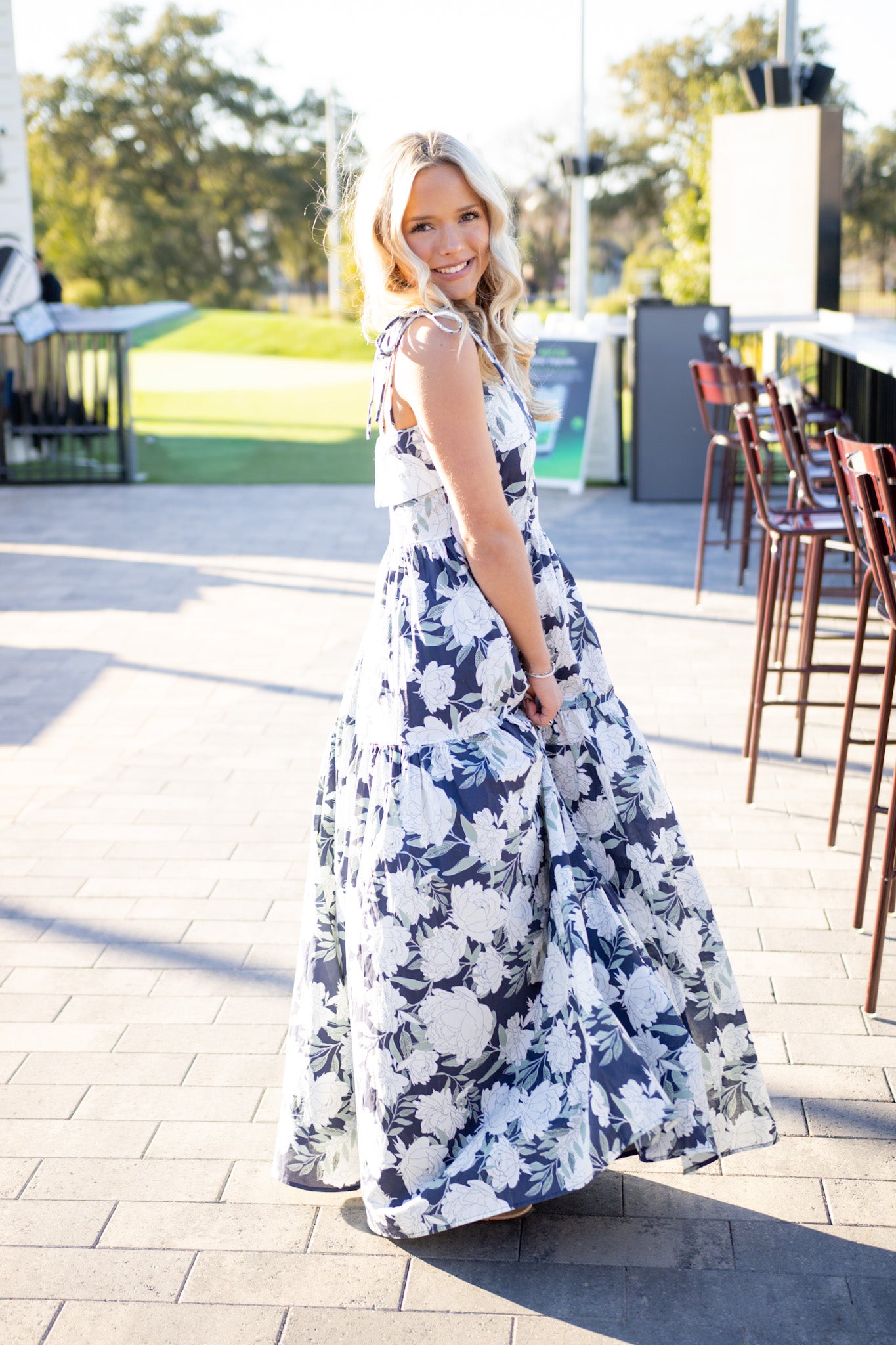 Twirl-worthy florals meet effortless elegance in this maxi dress. Tie shoulders add a flirty touch while the flowing silhouette skims beautifully to your feet. Lined for comfort and confidence, with a discreet back zipper for easy on-and-off. Whether you're heading to a garden party or a night out, this navy beauty brings color and movement to every moment.