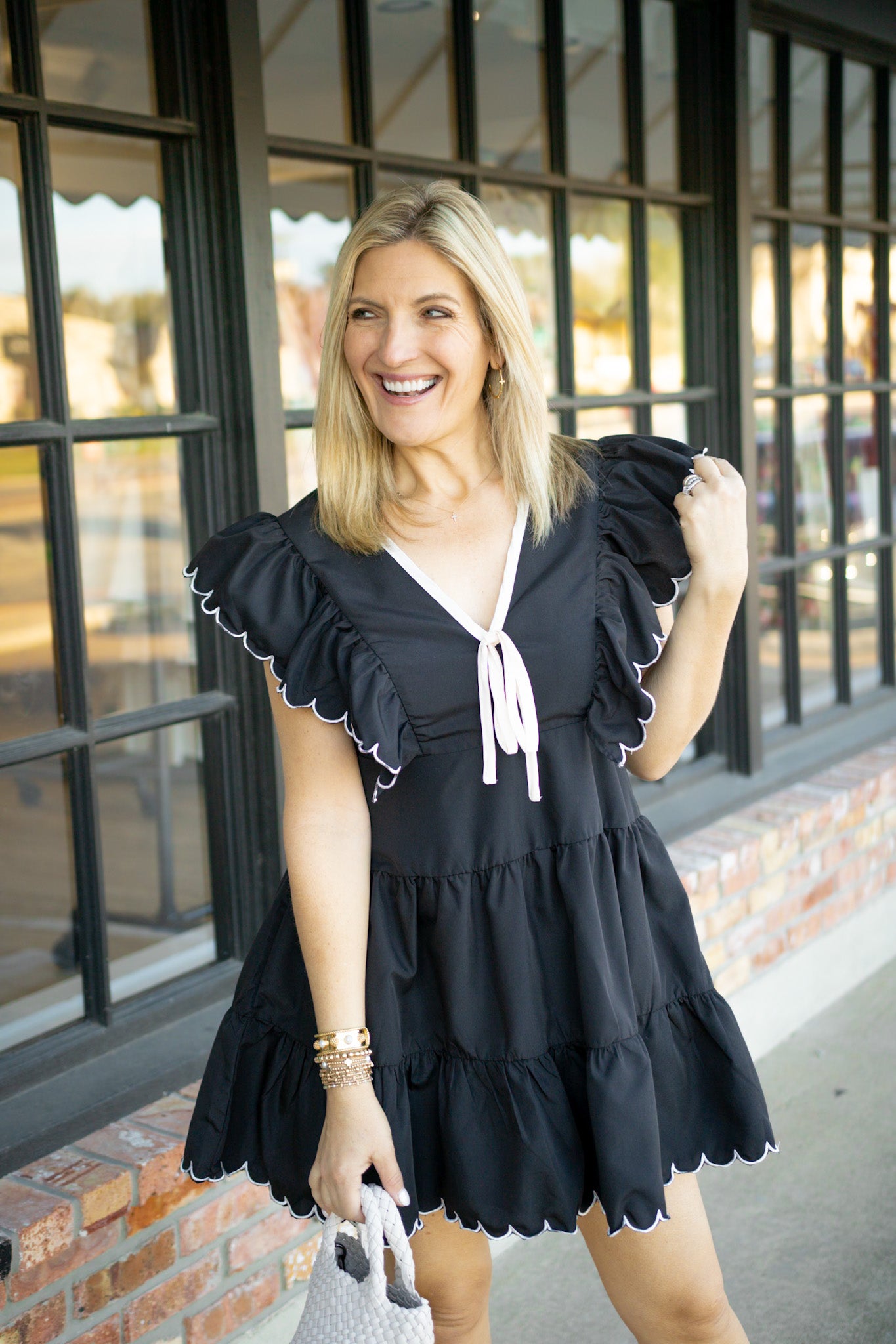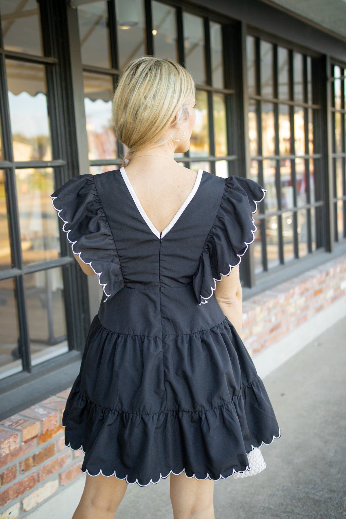 Sweetheart neckline meets playful elegance in this charming mini dress. Delicate bow detail adorns the bodice while scalloped poplin ruffle sleeves add a touch of whimsy. The tiered skirt features a scalloped hem and contrast color trim for visual interest, while a concealed back zipper ensures a polished finish. Perfect for date night, brunch, or any occasion calling for feminine flair.