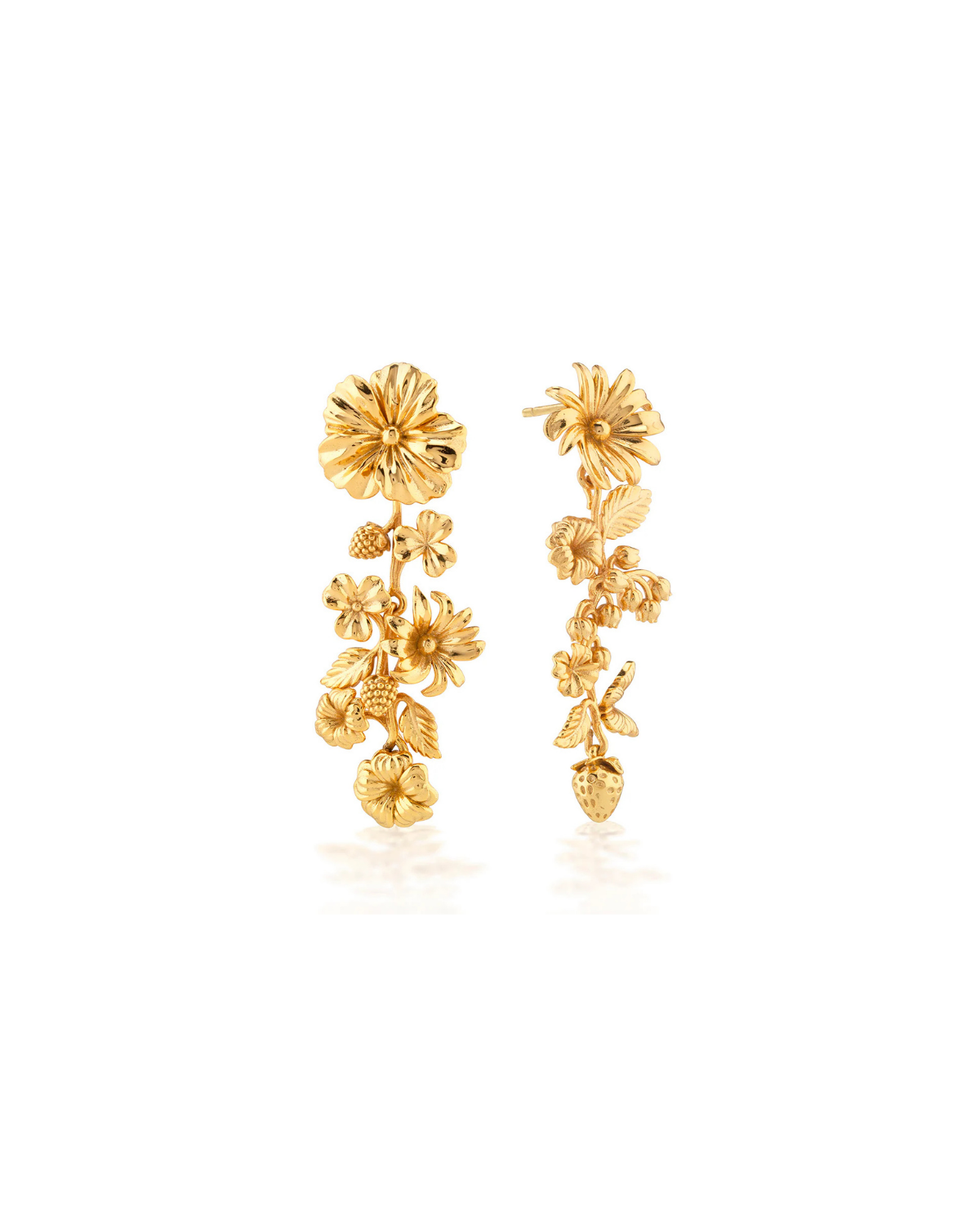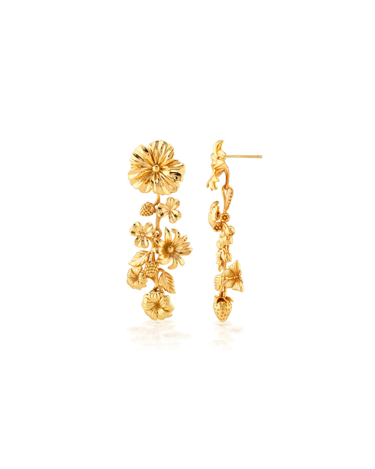A symphony of wild blossoms, berries, butterflies and leaves descend in a blooming cascade to compose these perfectly mismatched statement earrings that are rendered in bright gleaming gold. As if each botanical element was handmade in intricate detail by Mother Nature herself, this stunning and whimsical pair is what she’d wear to any spring garden party or summer fête.
