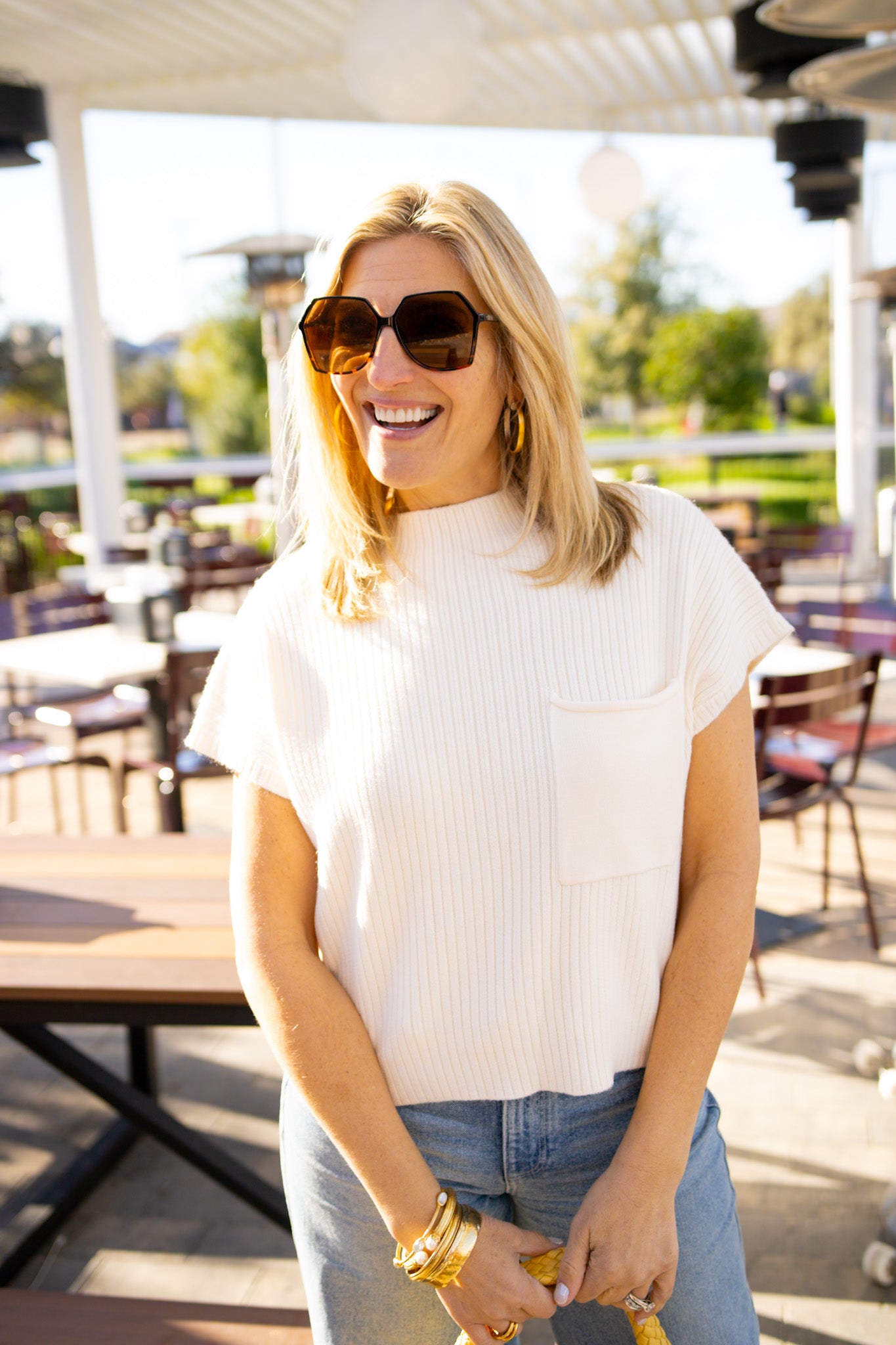 Cozy up in this cream knit sweater that's equal parts chic and comfortable. The mock neck keeps things polished, while practical pocket details add a fun twist—because who doesn't love hidden storage? Cap sleeves offer the perfect balance of coverage and ease, making it ideal for layering or wearing solo. A wardrobe essential that feels anything but basic.