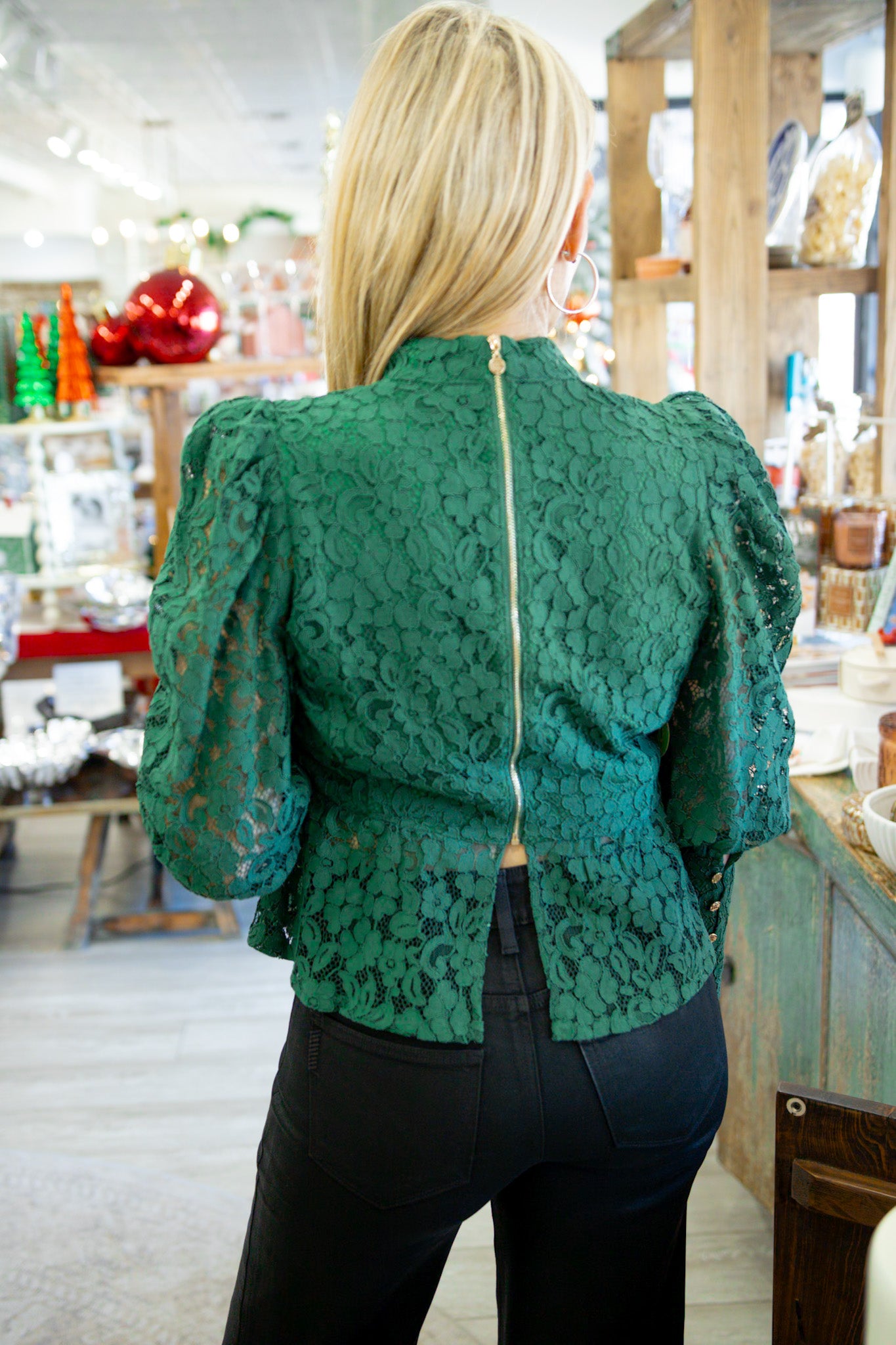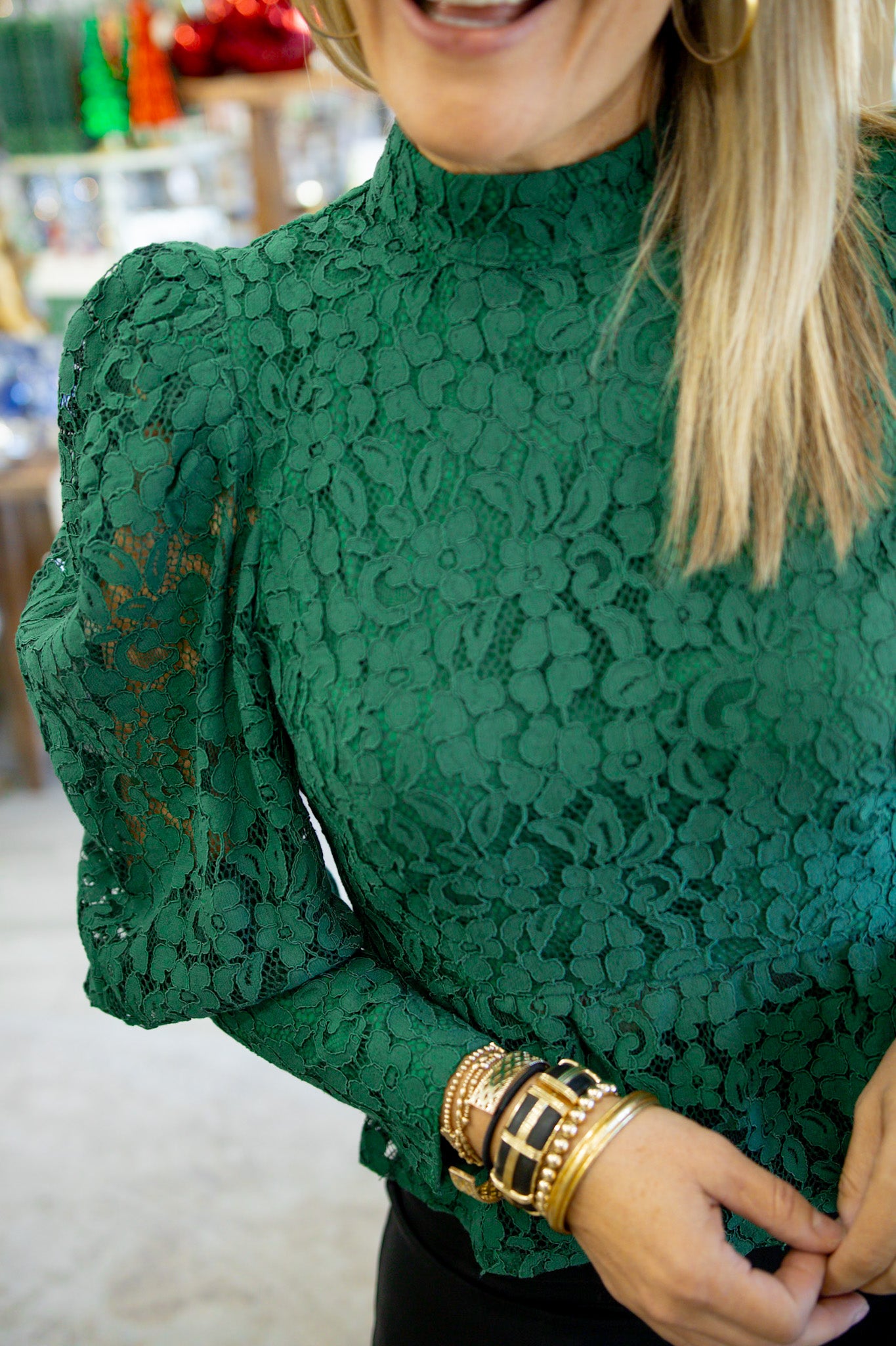 The Zoe Top in Eden Green features a mock neckline, puff sleeves with tapered cuffs, peplum hem, and an exposed zip closure at the back. Designed in intricate lace, the sleeves are left unlined to reveal a hint of skin through the puff silhouette, adding texture and dimension. A statement piece on its own, it pairs perfectly with the matching Paisley Pant for a bold and elevated holiday look.