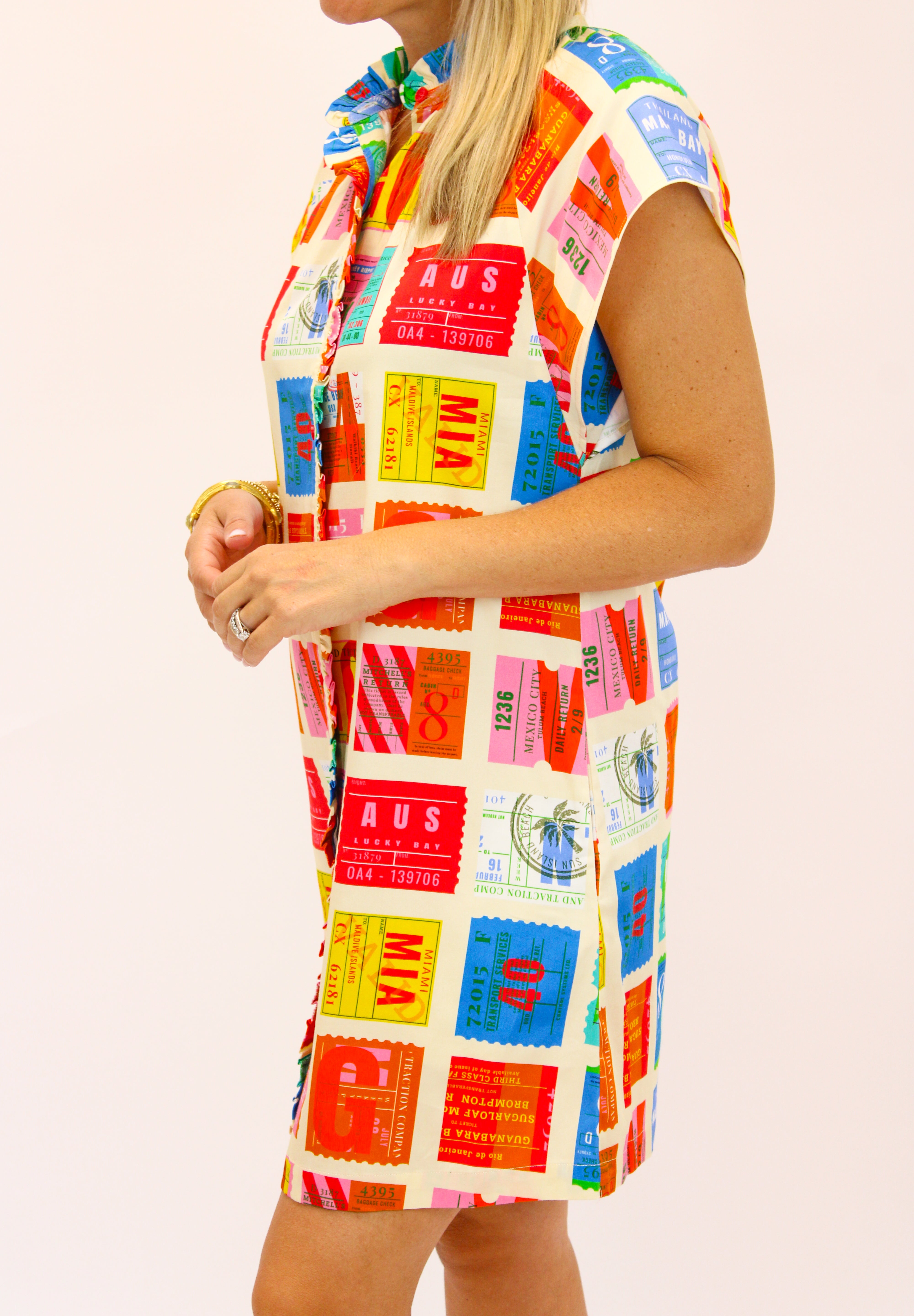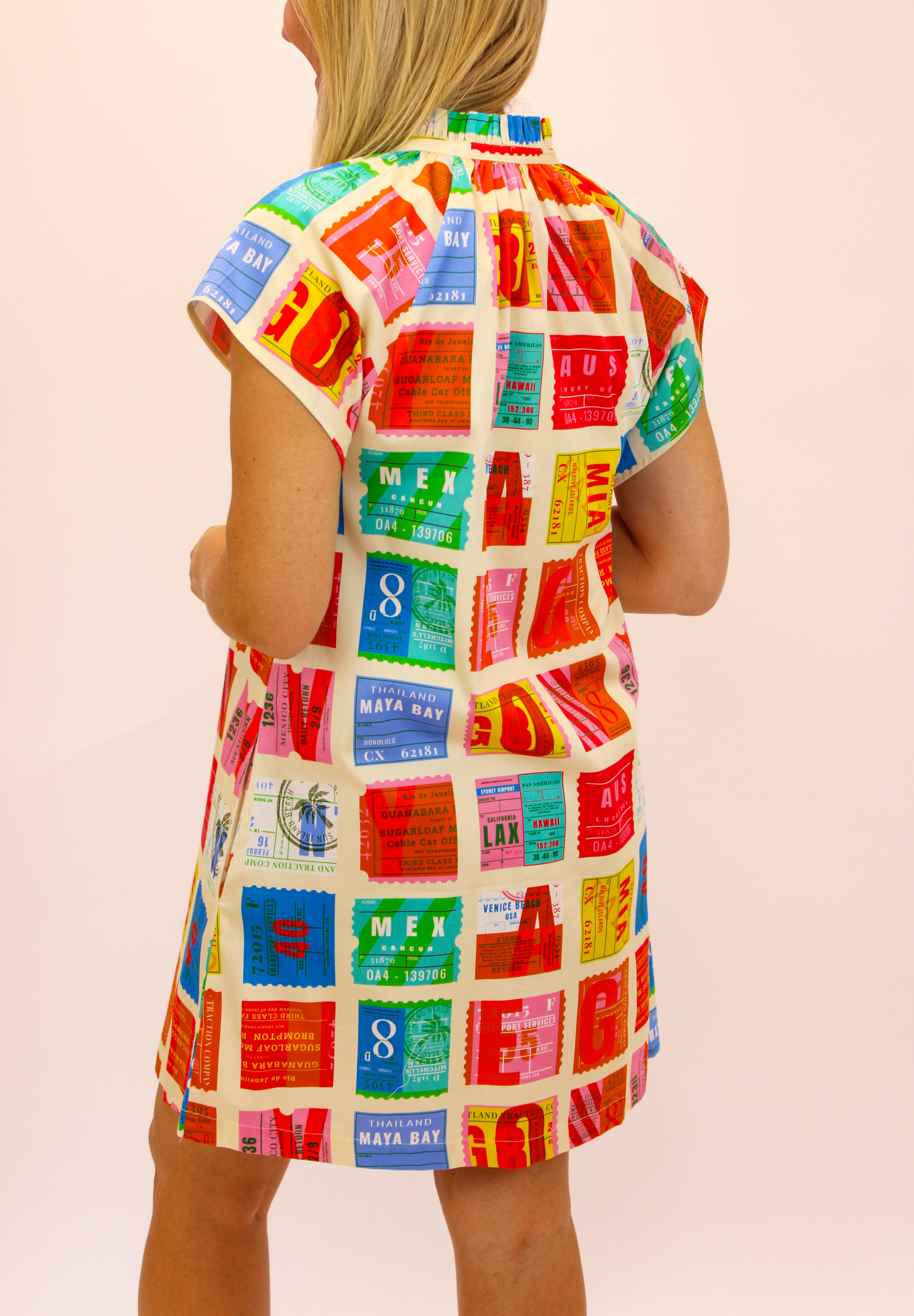 Get ready for a playful voyage with the Margot Dress. With a full button front closure and short sleeves, it's perfect for any adventure. The ruffle collar adds a fun touch, and the colorful stamps give it a unique style. Bon voyage in style with the Margot Dress. Plus, did we mention it has pockets?