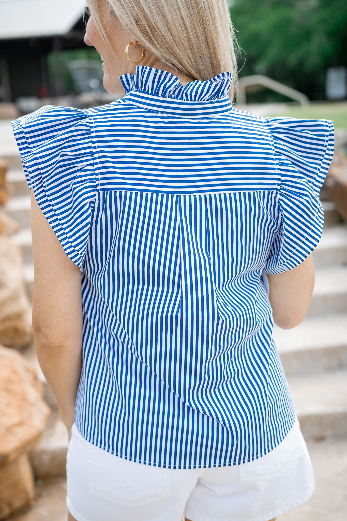 The kind of top that instantly brightens your closet. This blue and white striped blouse brings a fresh, playful feel with just the right amount of detail to make it stand out.