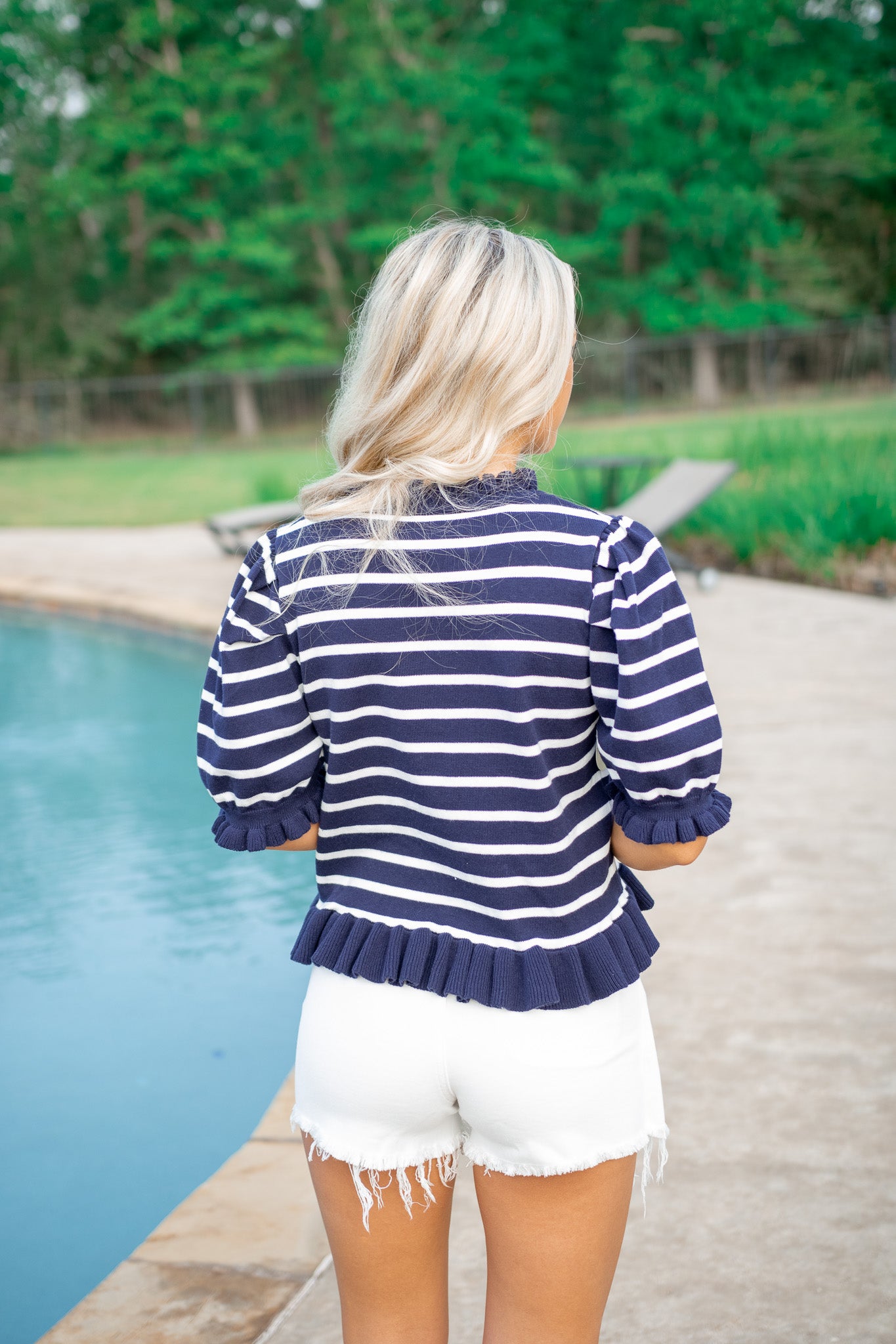 Bring coastal vibes to your everyday rotation with this charming button-up sweater. Crisp navy and white stripes pair perfectly with delicate ruffle detailing along the hems and sleeves for a touch of whimsy. The short sleeves keep things breezy and versatile—dress it up with tailored trousers or down with your favorite denim. A wardrobe essential that feels anything but basic.