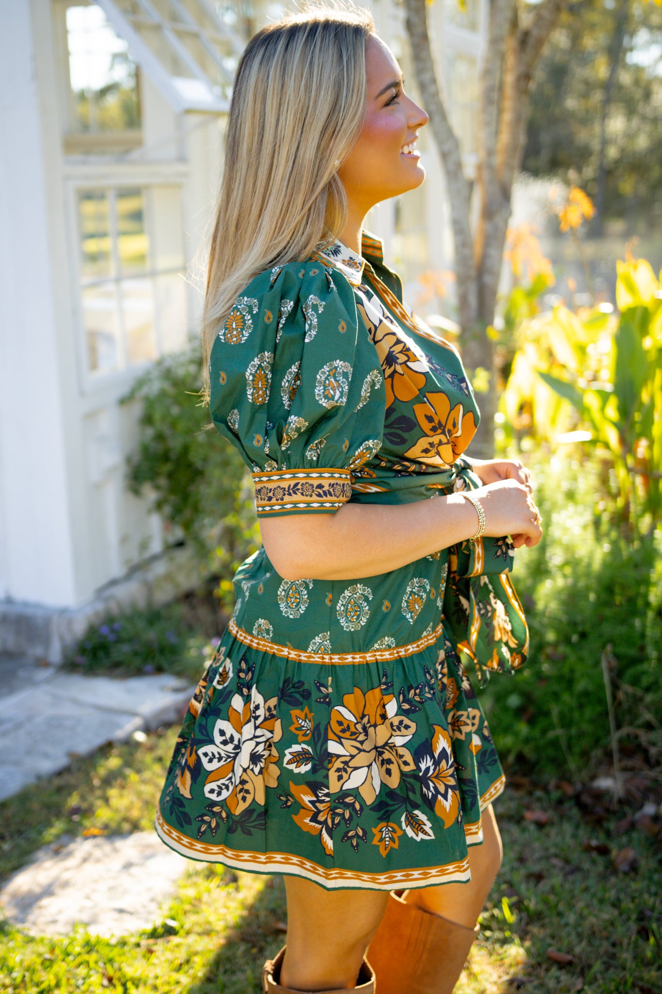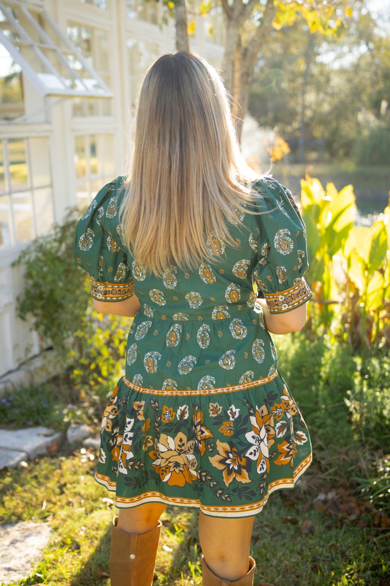 Ayla Short Puff Sleeve Organic Cotton Mini Dress, Green