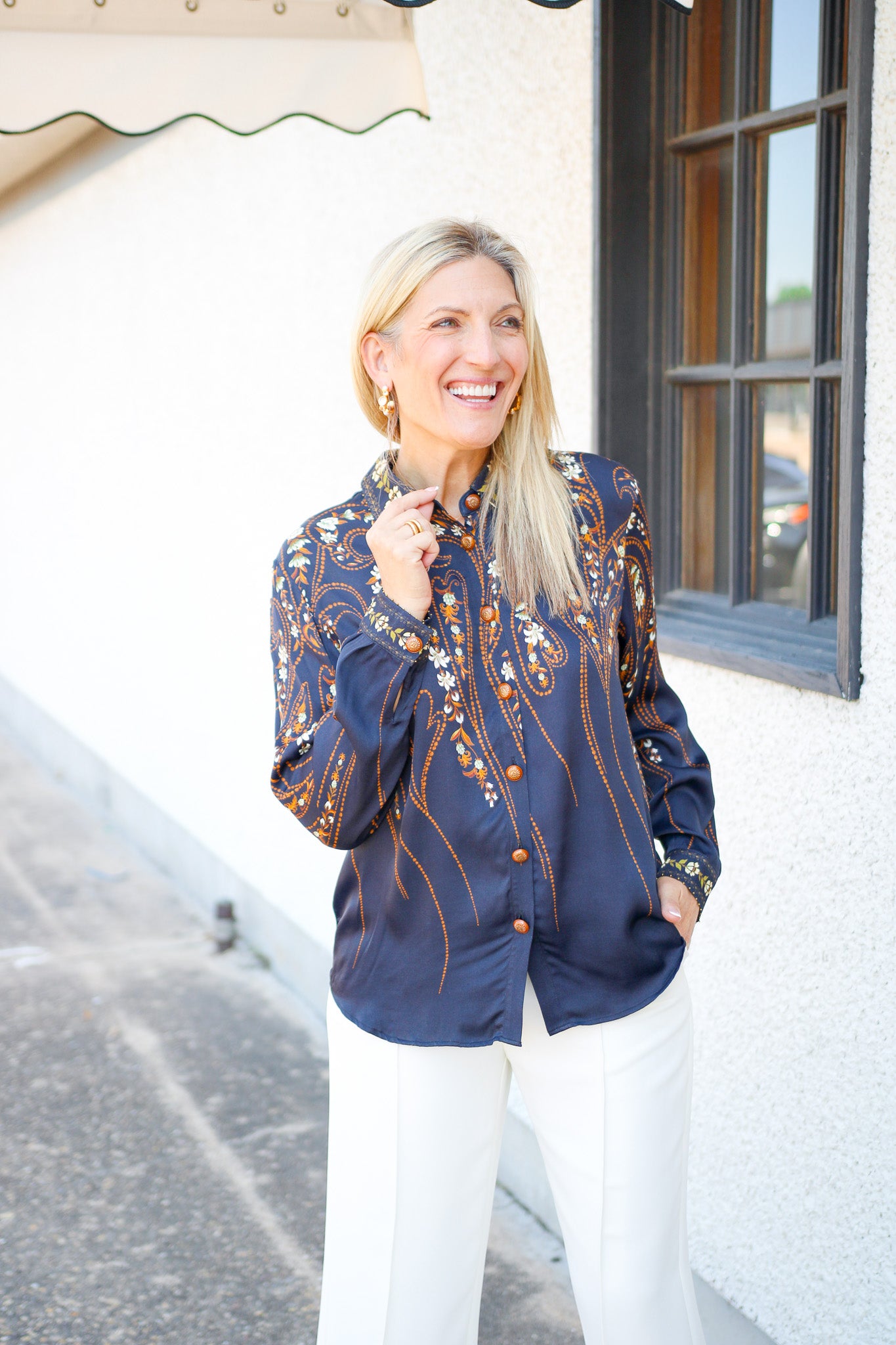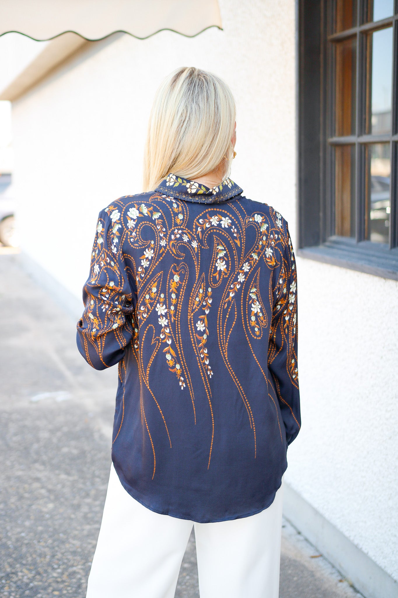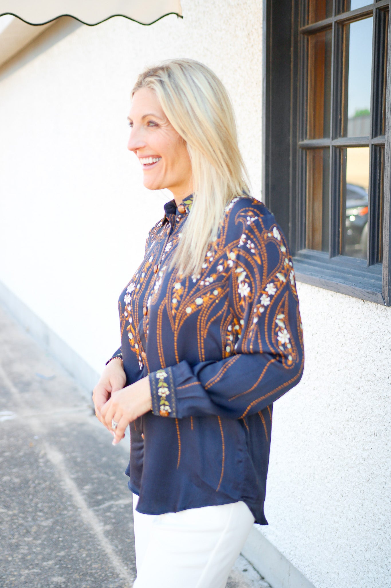 Bring a playful touch to your wardrobe with the Garden Silhouette Shirt in Black. This silky blouse features a vintage paisley print in burnt orange and cream, highlighted by charming wooden-tone buttons. Its relaxed fit and buttoned cuffs make it perfect for tucking into office trousers or pairing loose with denim for a chic weekend vibe. Effortless style in every season!
