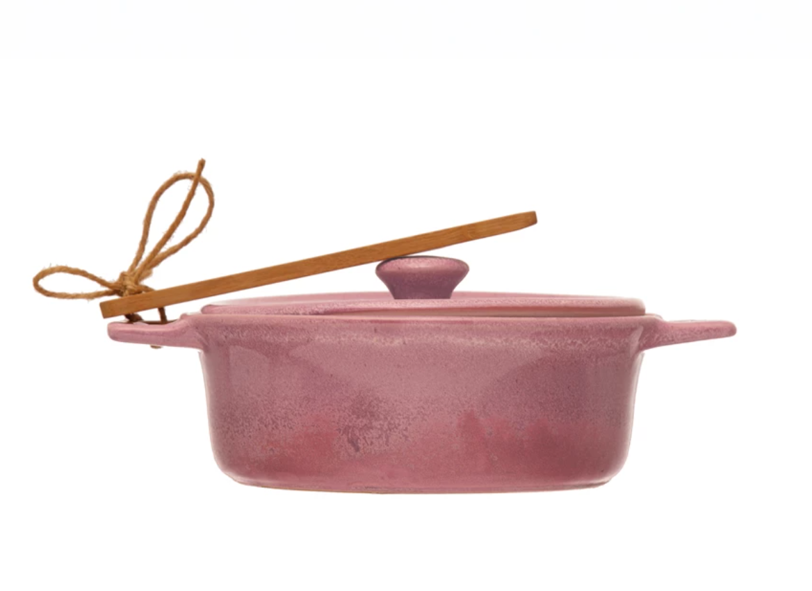 Stoneware Brie Baker with Bamboo Spreader, Pink