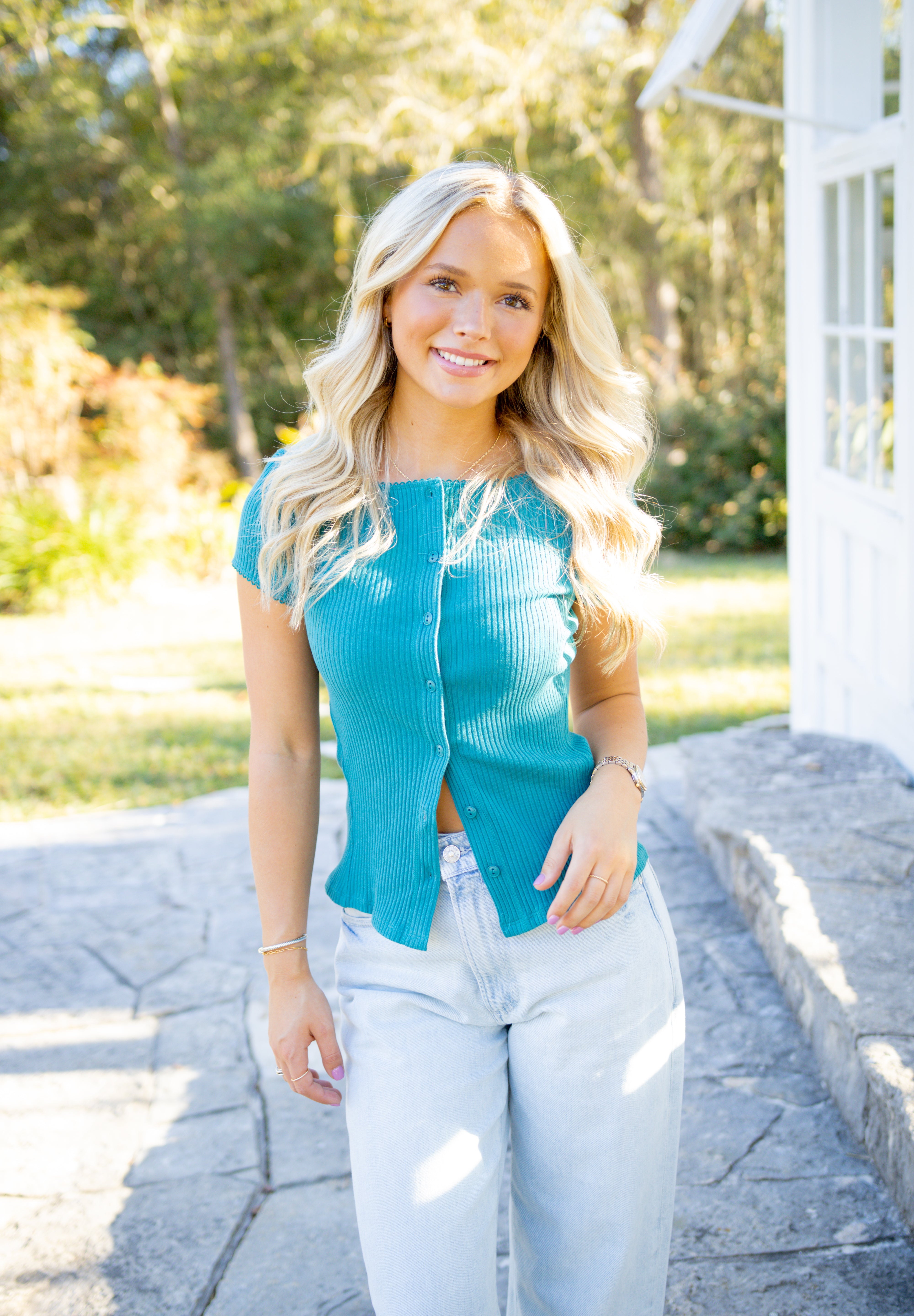 Features: Ribbed swit fabrication, crew neckline, button-front closure, capped sleeves, picot trim