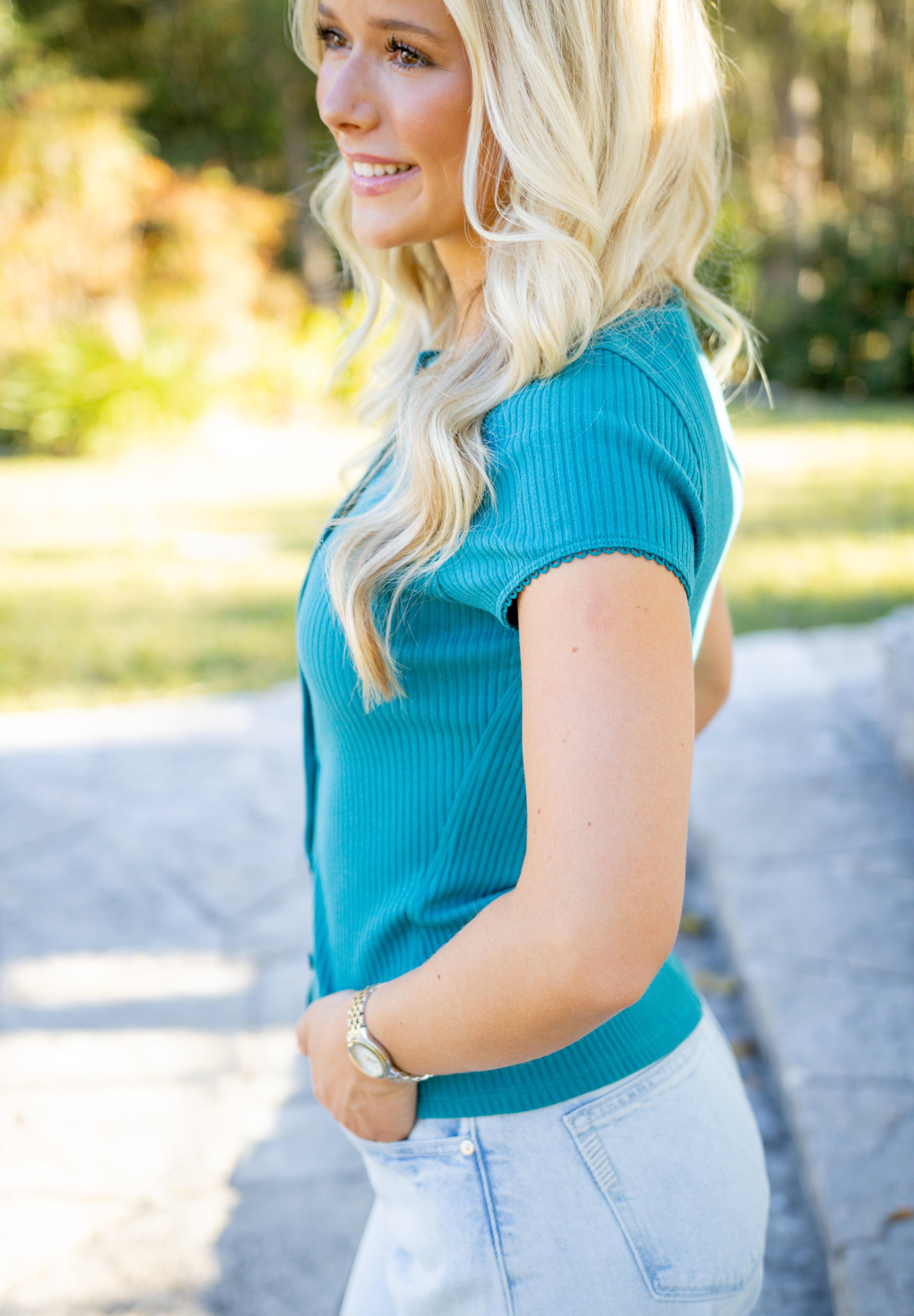 Cute and classic, this shrunken cardi is featured in a hugging ribbed fabrication with short capped sleeves and buttons all the way up the front.