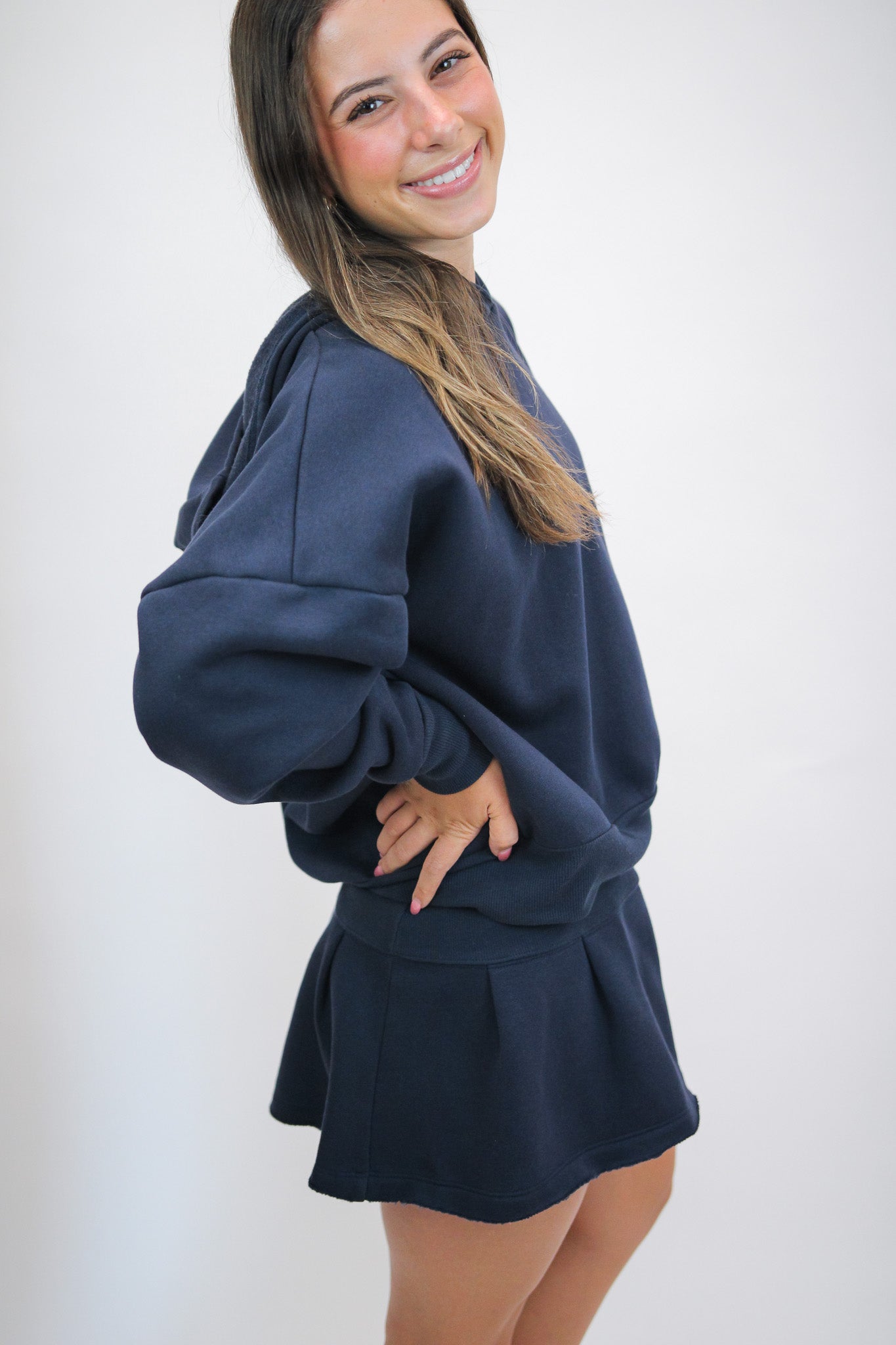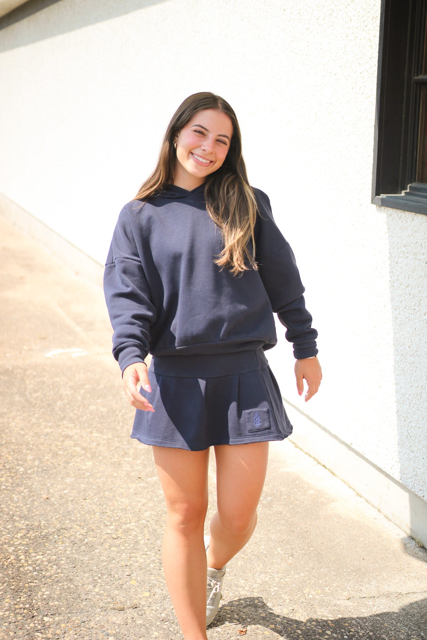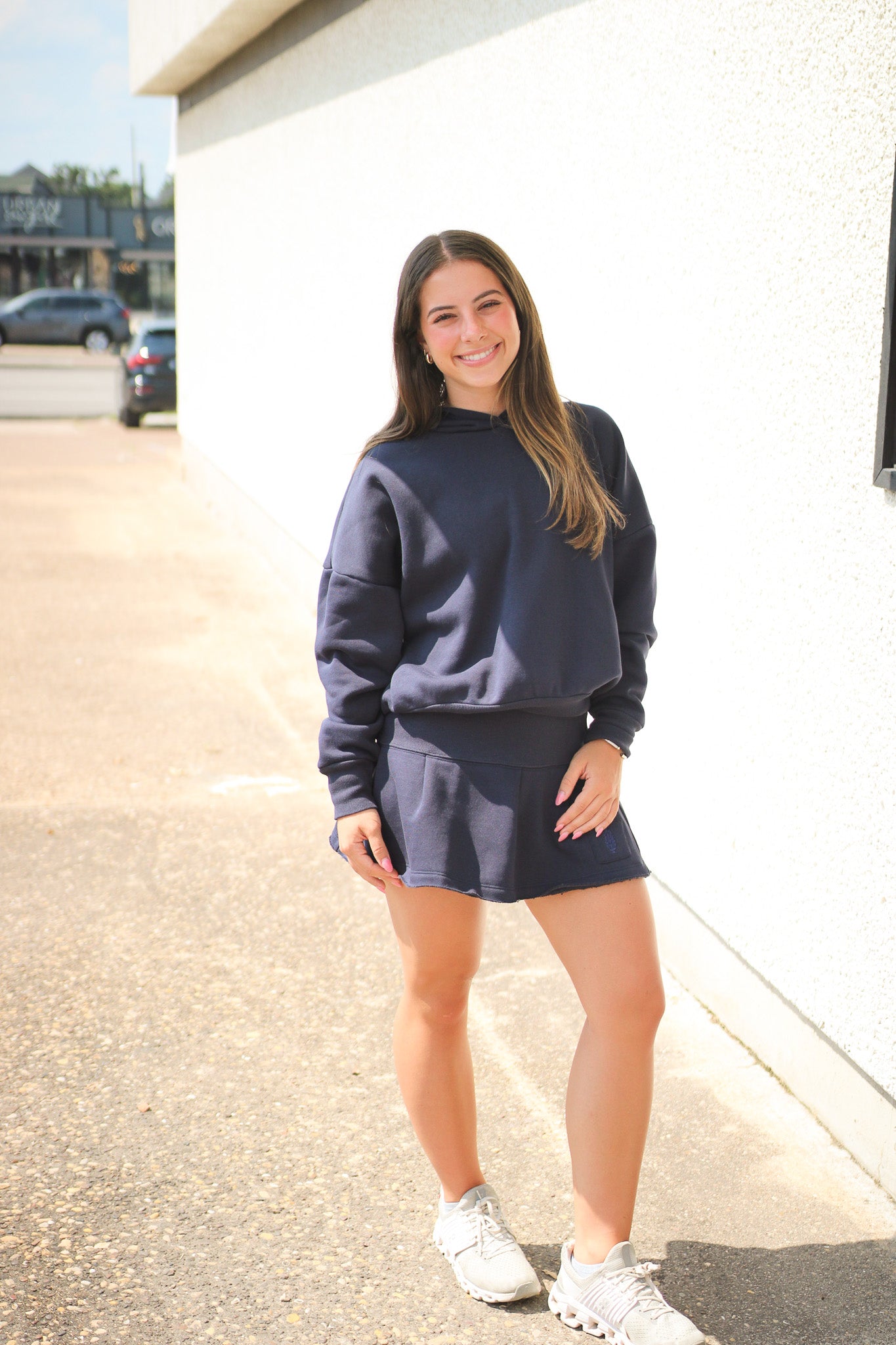 Ultra-comfy and easy to throw on, this sweatshirt and skirt combo from our Sprint To The Finish collection is the perfect to-from set. Cropped, relaxed-fit hoodie is paired with an ultra-short mini with pleated detailing.