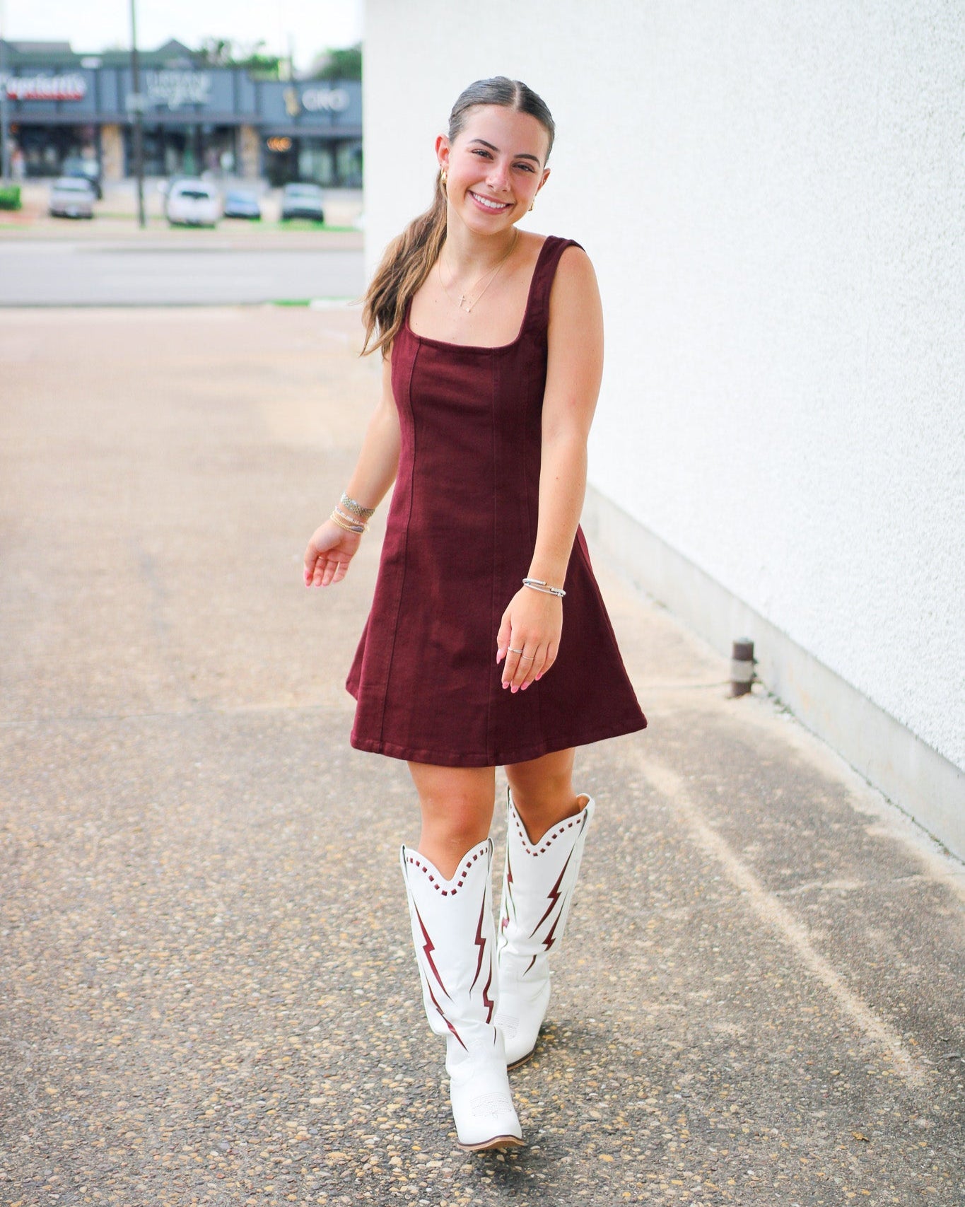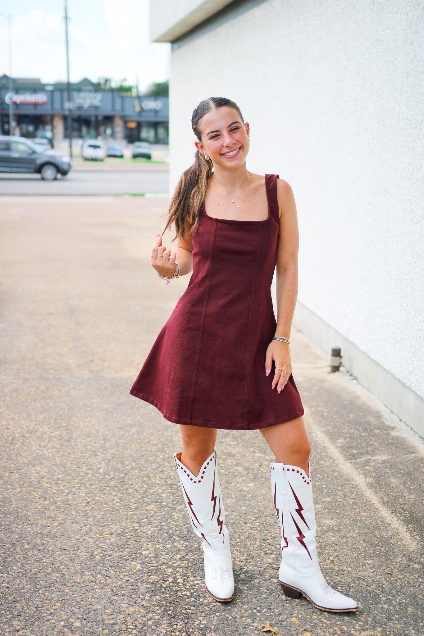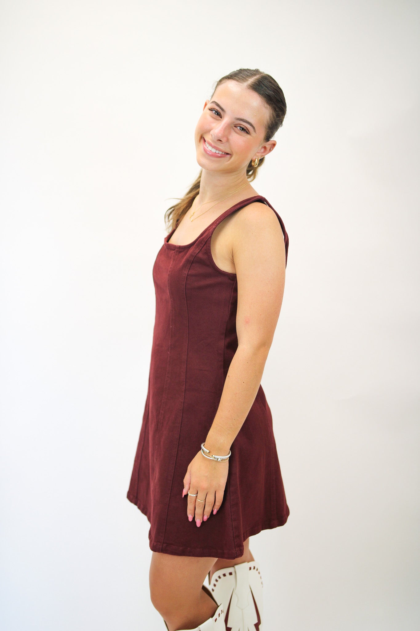 Get game day ready with the Ready For It Mini Dress in maroon! This playful square neck dress, crafted from comfy denim, is the perfect mix of sporty and stylish. Whether you're cheering on your team or heading out with friends, its mini length and flattering cut let you move with confidence and show off your spirited style. Score big on comfort and flair every football season!