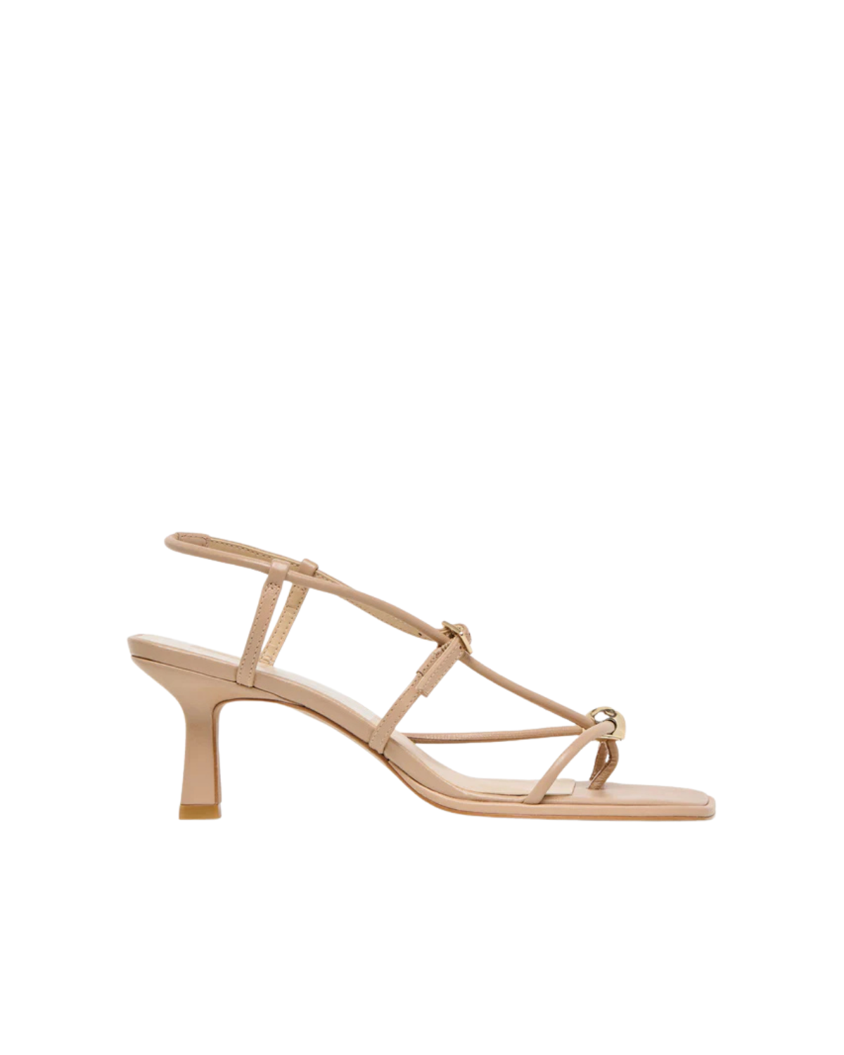 Understated, strappy, and goes with everything. MYLEE’s architectural heel and minimalist hardware add a cool modern touch to dresses and matching sets.