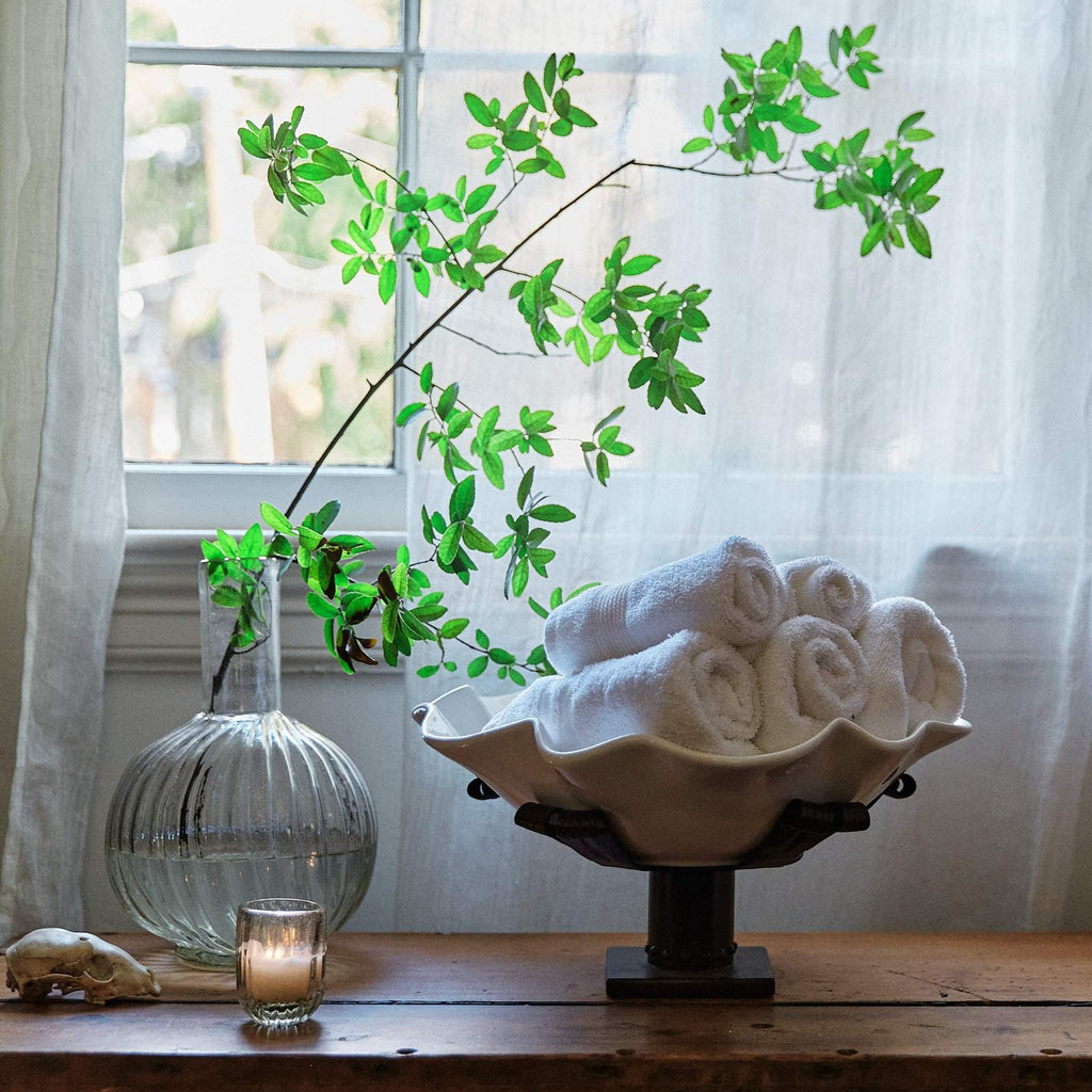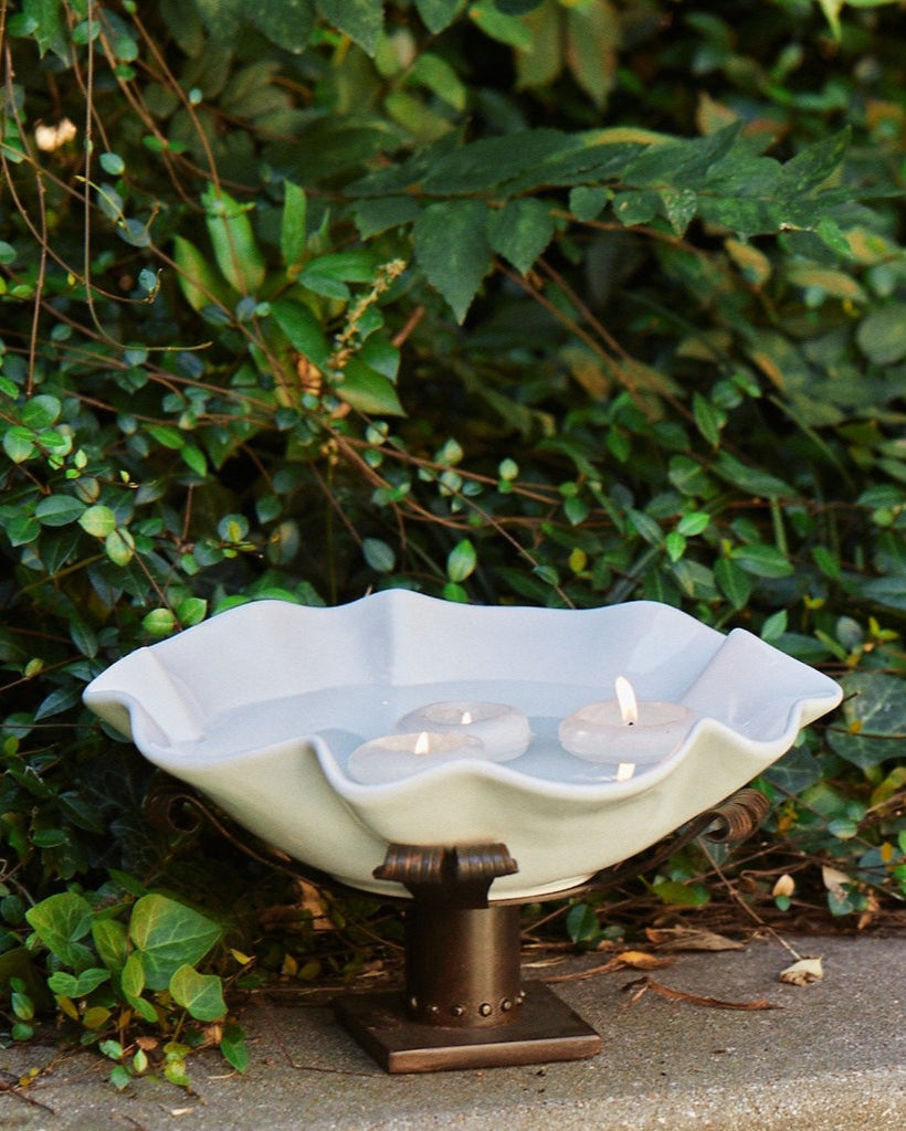 Branded, sealed creamy white ceramic bowl in full bloom, resting atop a forged iron base
