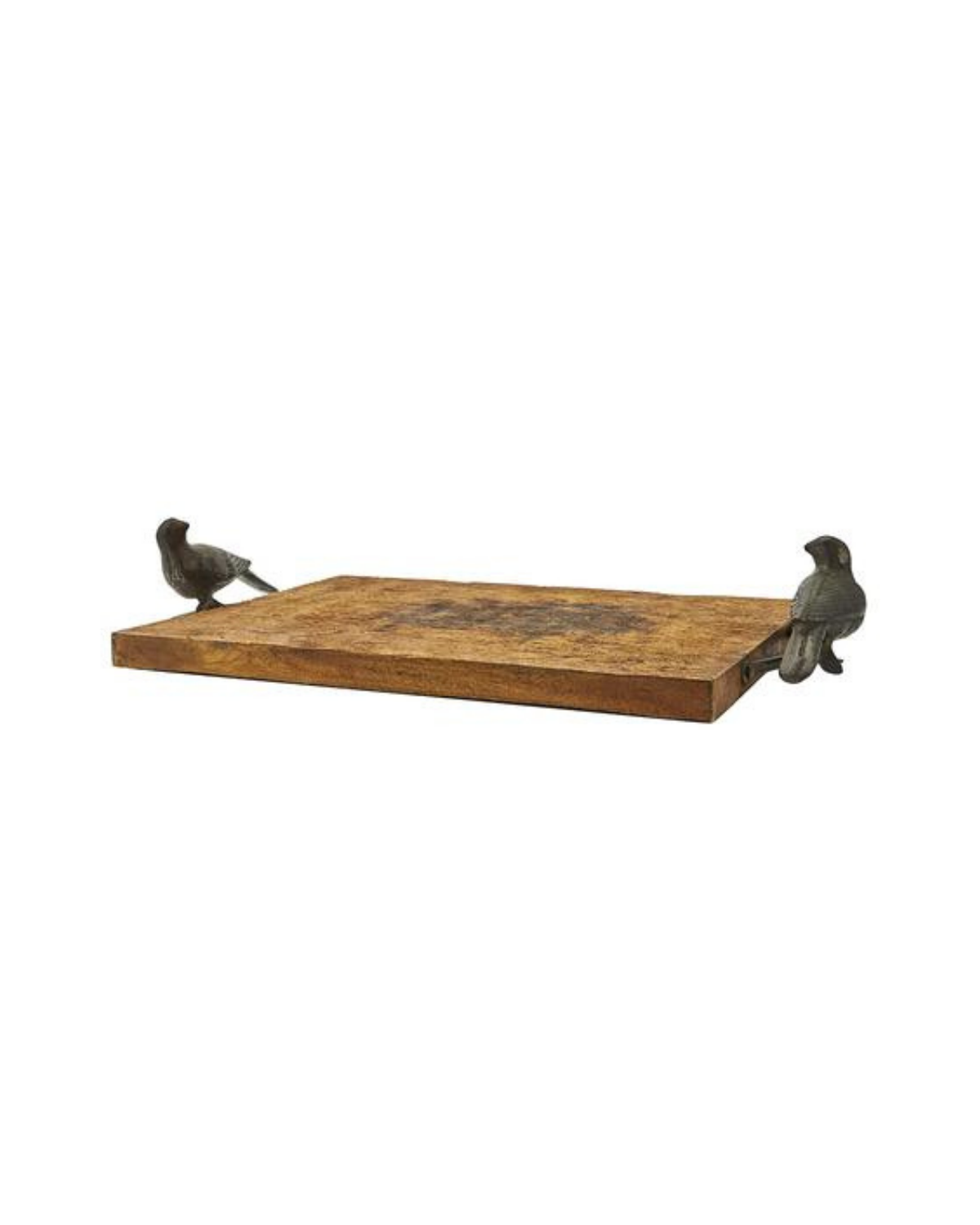 Rough-hewn cutting board with cast iron bird handles.