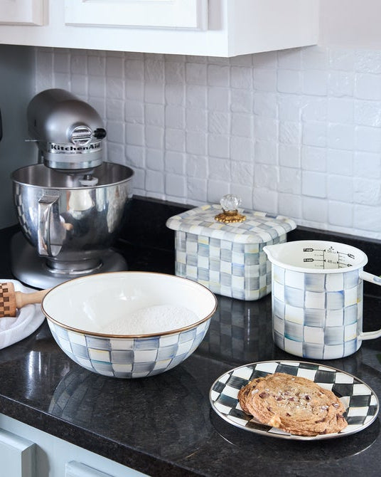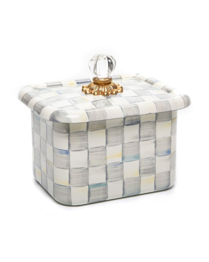 Hand-glazed, heavy-gauge steel underbody with hand-painted Sterling Check decoration, glass knob, and brass accents. Includes set of recipe cards and recipe card dividers. Pieces may vary due to the handmade nature of each product. Imported.
