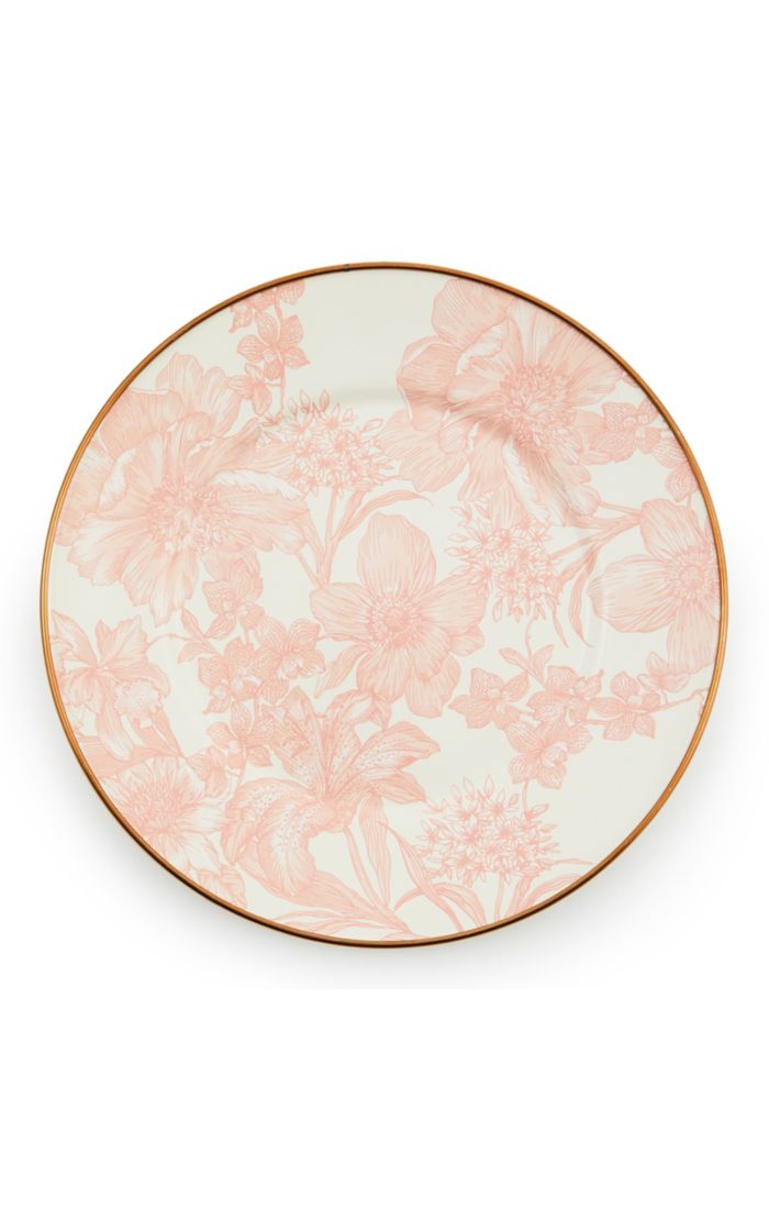 Heavy-gauge, hand-glazed steel underbody with hand-painted Rosy Checks, rimmed in bronzed stainless steel. Brass and glass accents. Pieces may vary due to the handmade nature of each product. Imported.