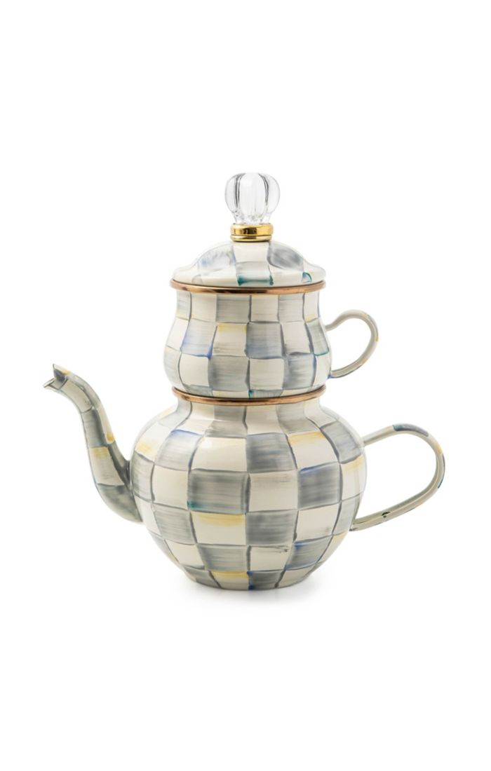 Bubbling over with MacKenzie-Childs style, our Sterling Check® Enamel High Tea is ready for your personal tea party. Consisting of a pot, cup, and lid made of heavy-gauge steel, it features hand-painted grey checks and is rimmed in bronzed stainless steel.