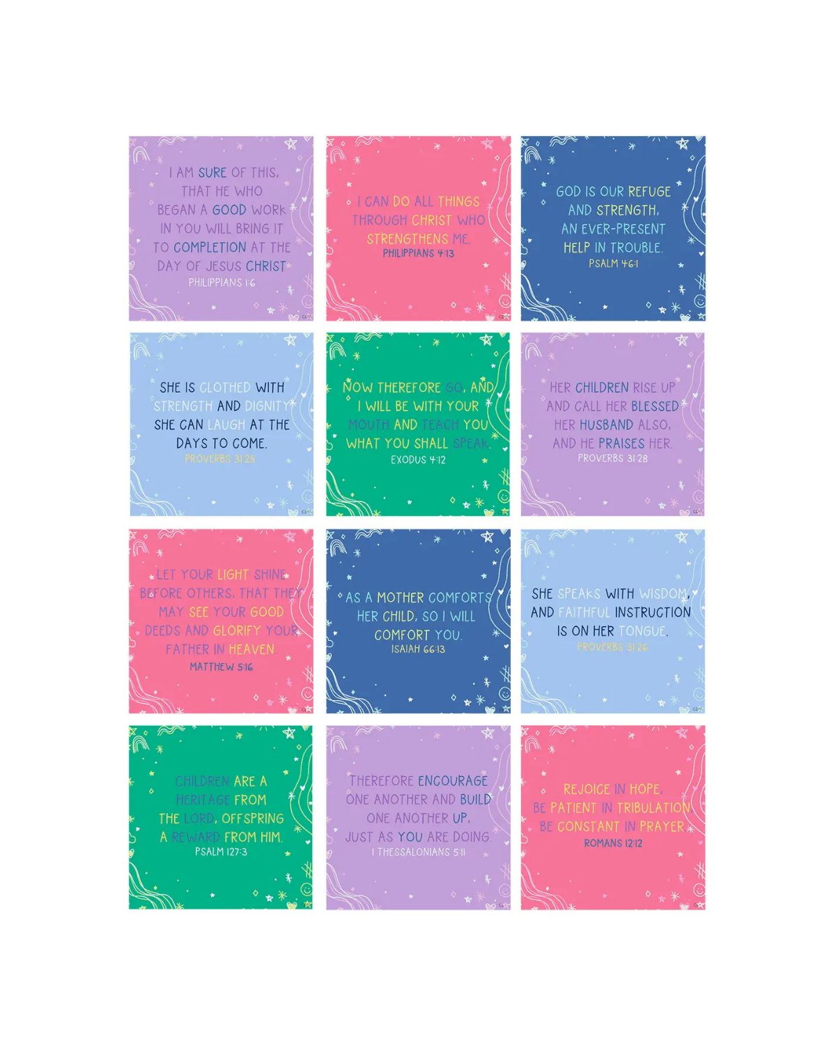 Encourage the moms in your life with the Verses for Mothers Bible Verse Card Set. This thoughtful desktop set includes 24 hand-lettered Scripture cards filled with truth, rest, and encouragement—perfect for the busy, tired, and grace-filled moments of motherhood. The star-accented stand makes it easy to display one verse at a time on a desk, kitchen counter, or nightstand. Whether you’re gifting it for Mother’s Day, a baby shower, or just because, this set is a sweet reminder that she’s never alone. A meaningful way to speak life and love over every season of motherhood.