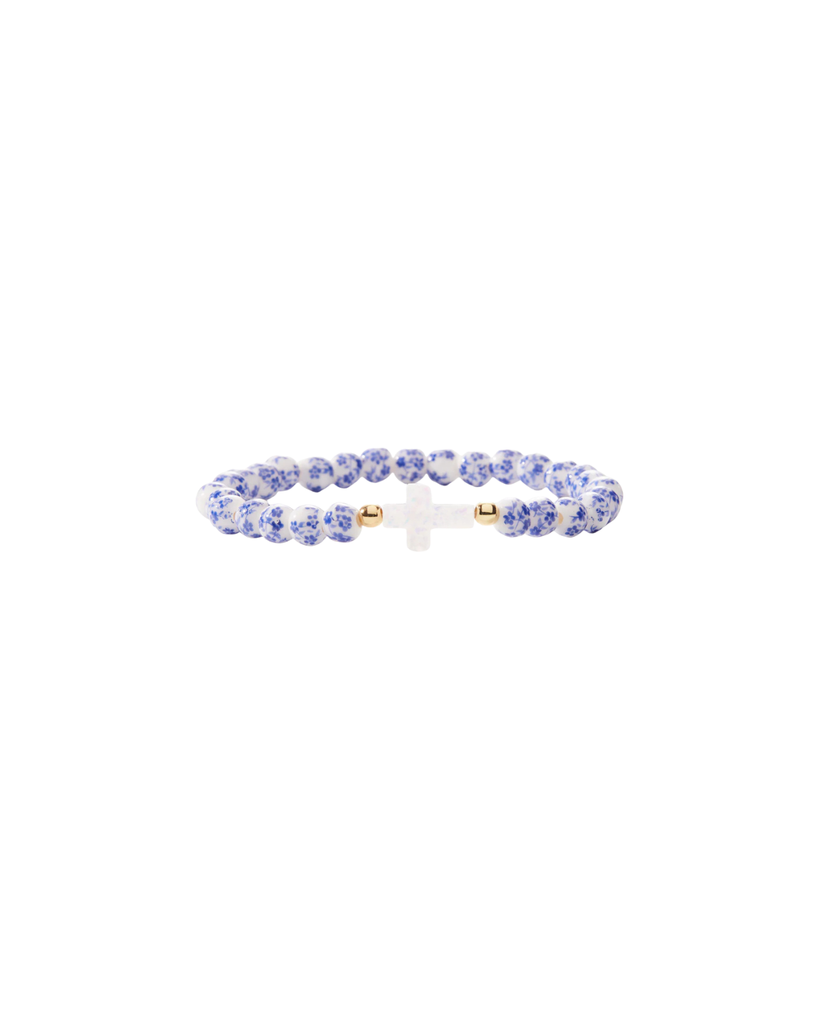 Discover the timeless beauty of our porcelain floral collection, where tradition meets contemporary style. Crafted with 6mm porcelain beads adorned with a delicate blue floral pattern, this bracelet showcases our signature cross infused with authentic holy water sourced directly from Lourdes, France.