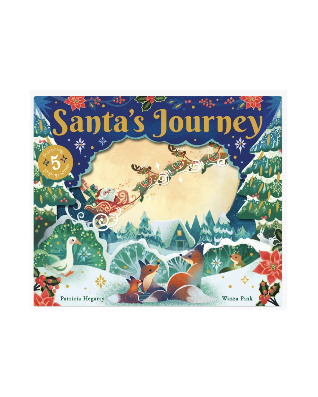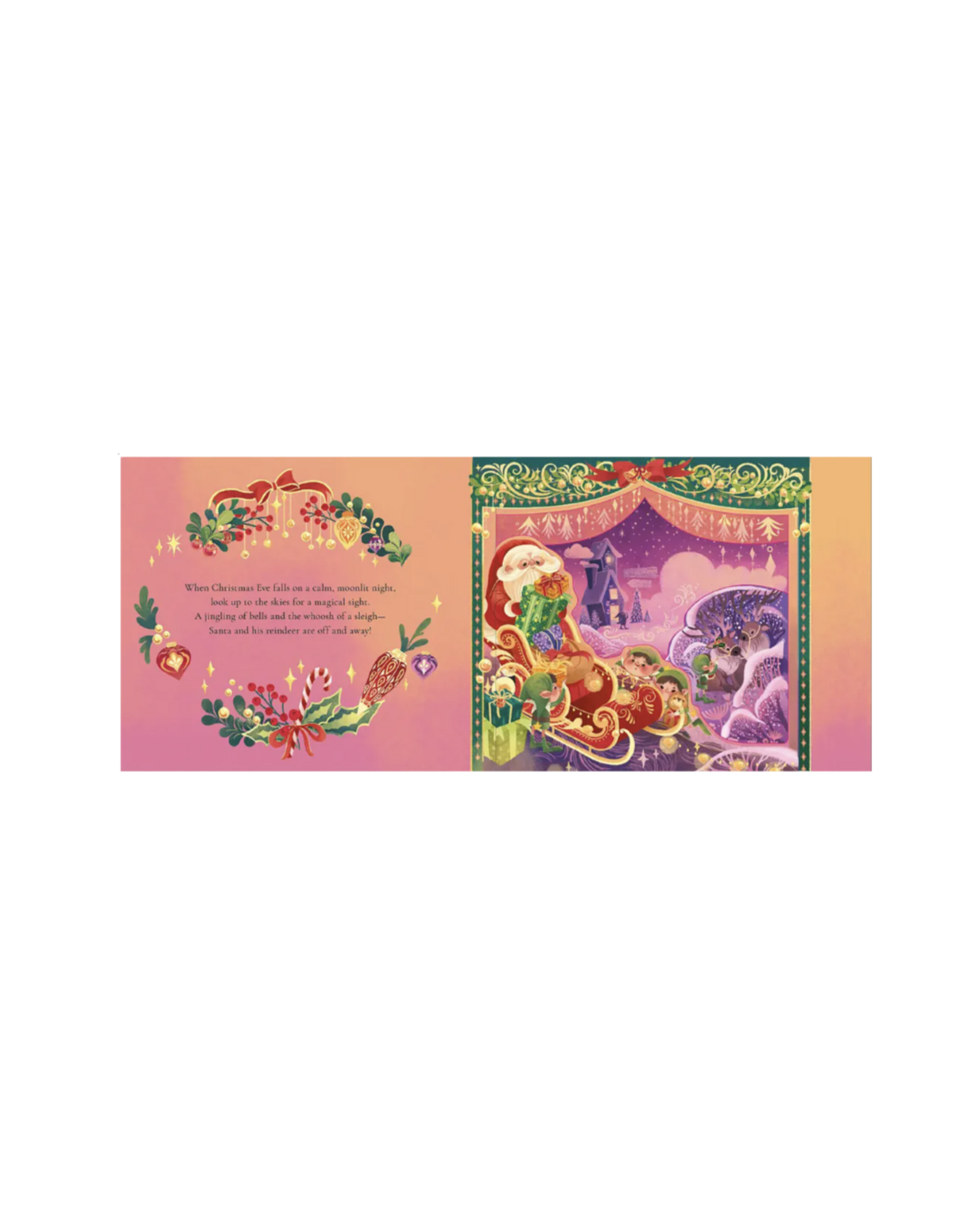 Every year Santa makes his magical journey on his sleigh, piling his sleigh high with shiny wrapped gifts for kids across the world. Follow him and his reindeer into the sky, and soar over the mountains, lakes, and trees, discovering the beauty below and the spreading Christmas cheer.