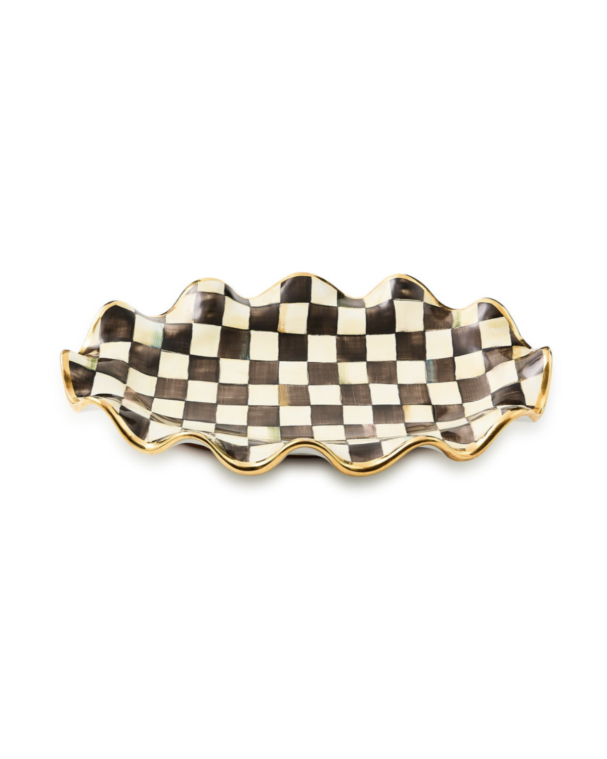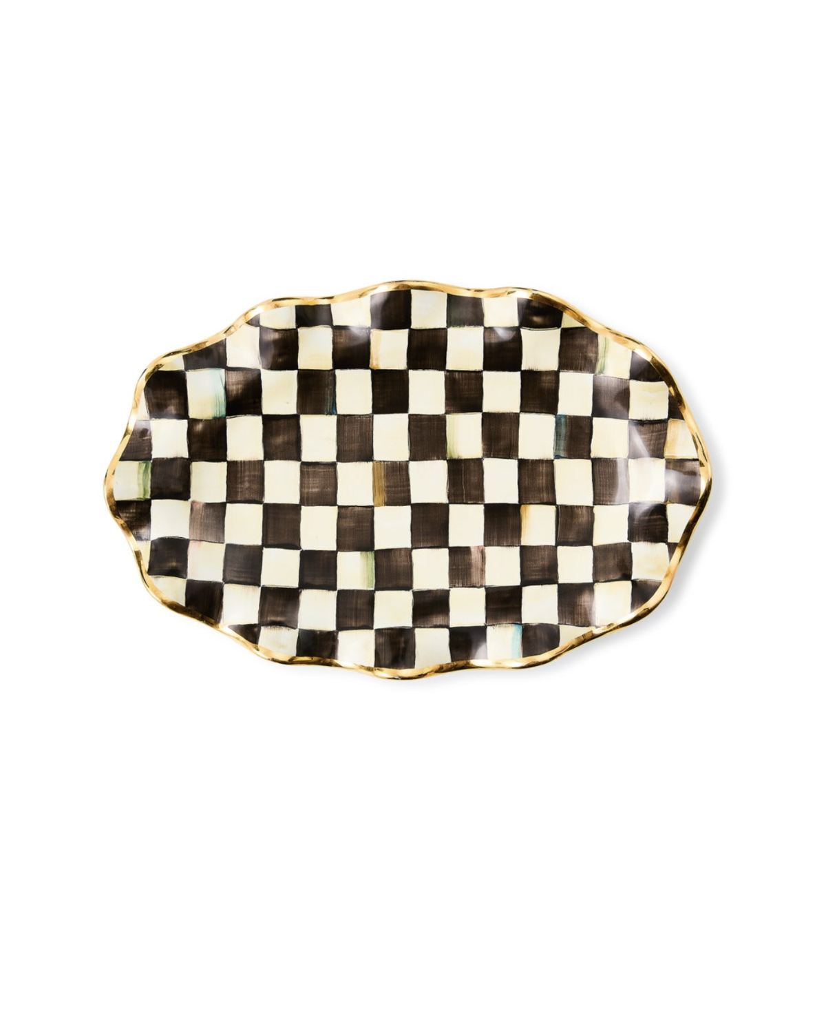 Like a work of fine art, the signature main course you’ve perfected merits the perfect frame. With the flowing ripples of its fluted rim and handsome pattern, the Courtly Check® Large Oval Serving Platter will present your dish with the fanfare it deserves. A beautiful juxtaposition of ivory and onyx, our deceptively simple signature checks reveal an intricate spectrum of jewel-toned colors. Hand-painted with deft brushstrokes by our master artisans, each piece is unique, with the exposed terra cotta base stamped by each artisan involved in its creation. Courtly Check® is golden-edged and gorgeous.