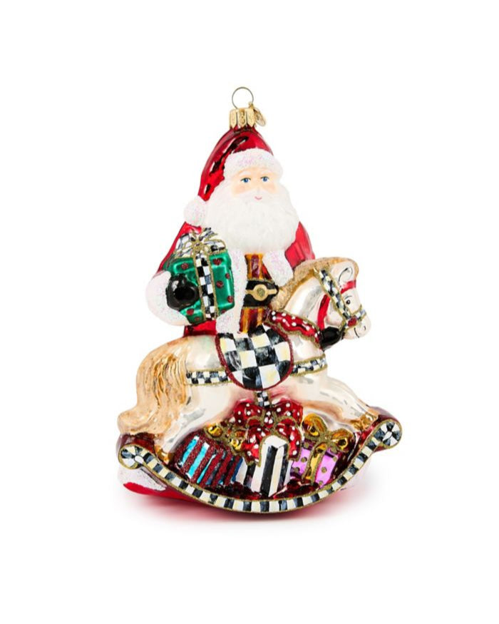 Celebrate the magic of the season with the Santa with Rocking Horse Glass Ornament. This whimsical ornament features Santa lovingly placed beside a rocking horse, hand-painted with festive details that evoke holiday cheer. The stunning collectible comes with an authentic brass logo charm, making it a wonderful gift or addition to your own Christmas tree
