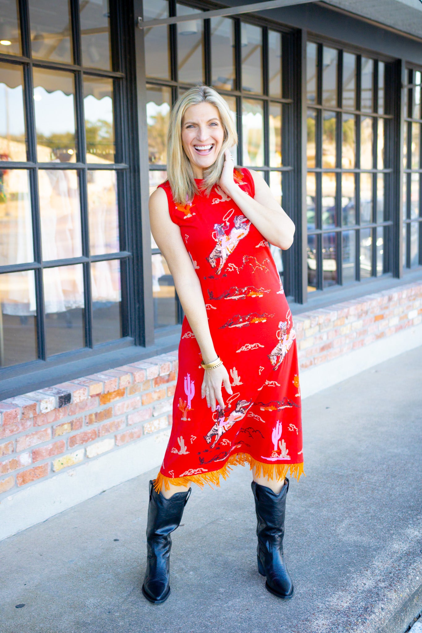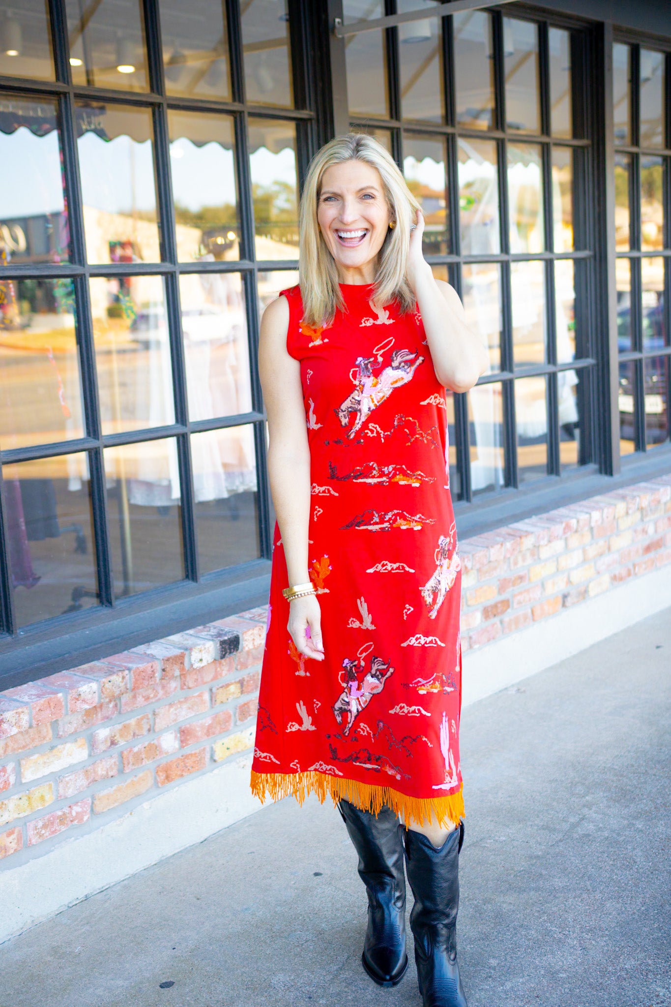 Bucking Cowgirl Fringe Bottom Midi Tank Dress, Red
