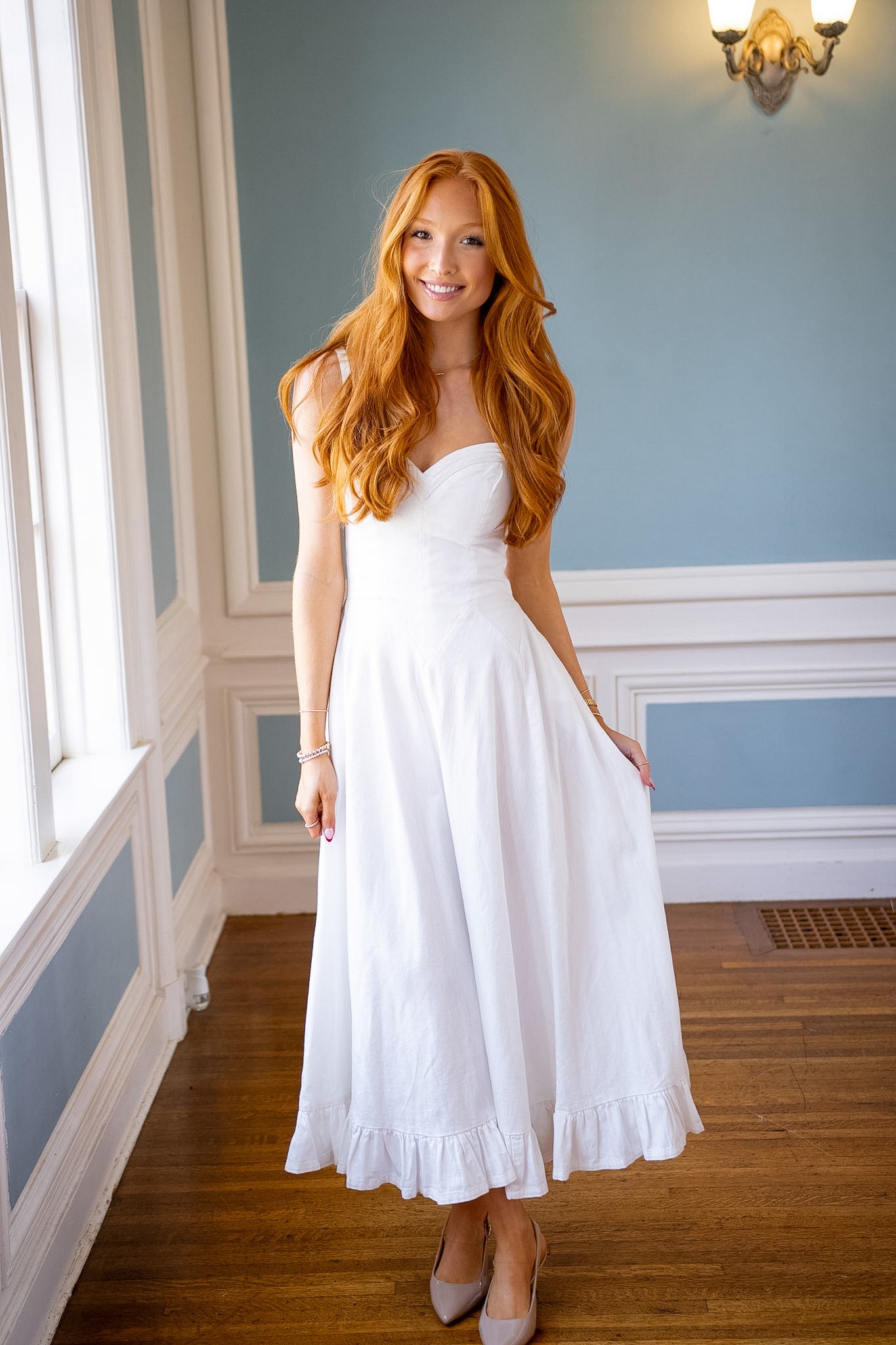 Perfectly preppy and so charming, this effortless midi dress features a flattering A-line silhouette, a lightweight cotton fabrication, and a dainty sweetheart neckline for a delightful finish.