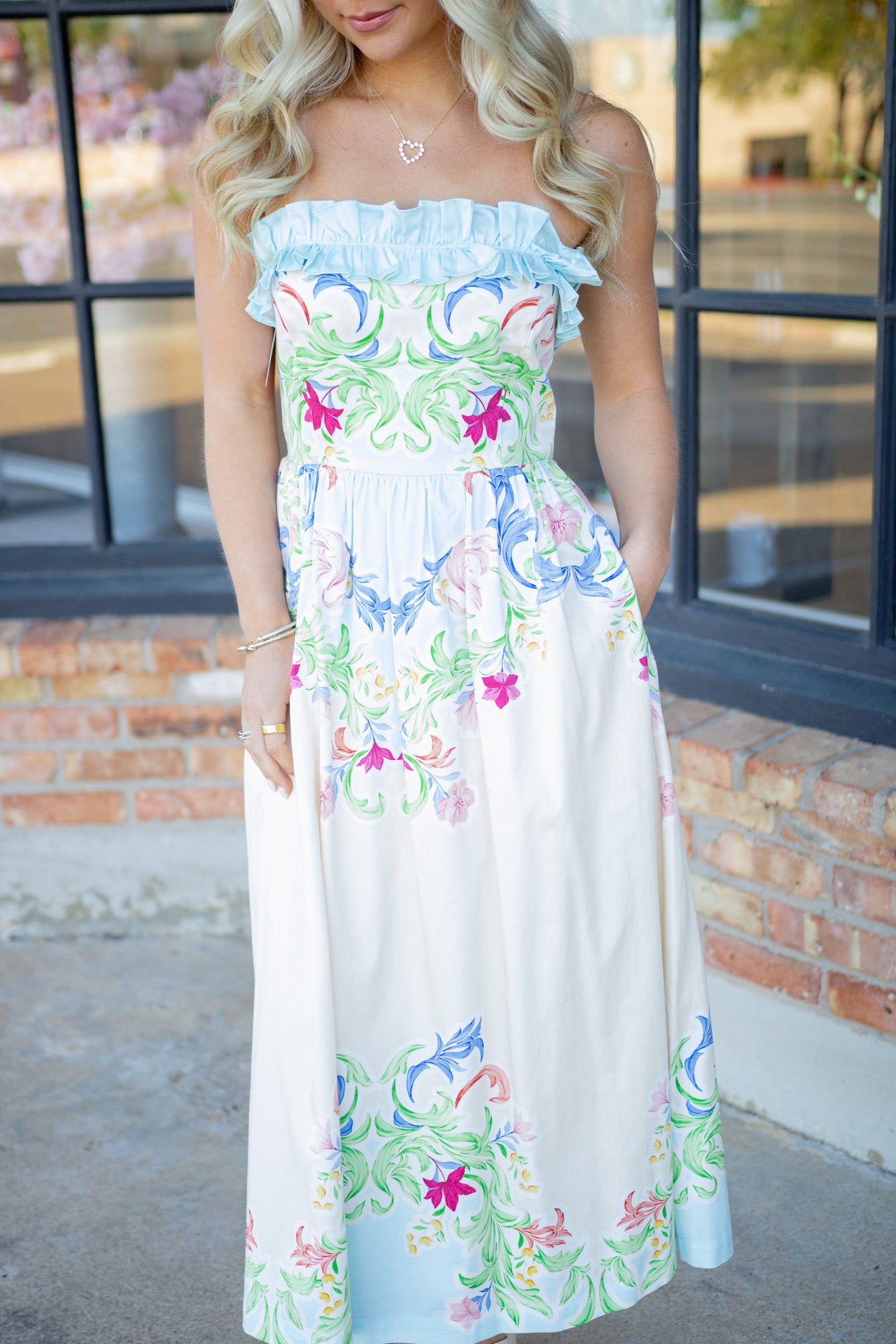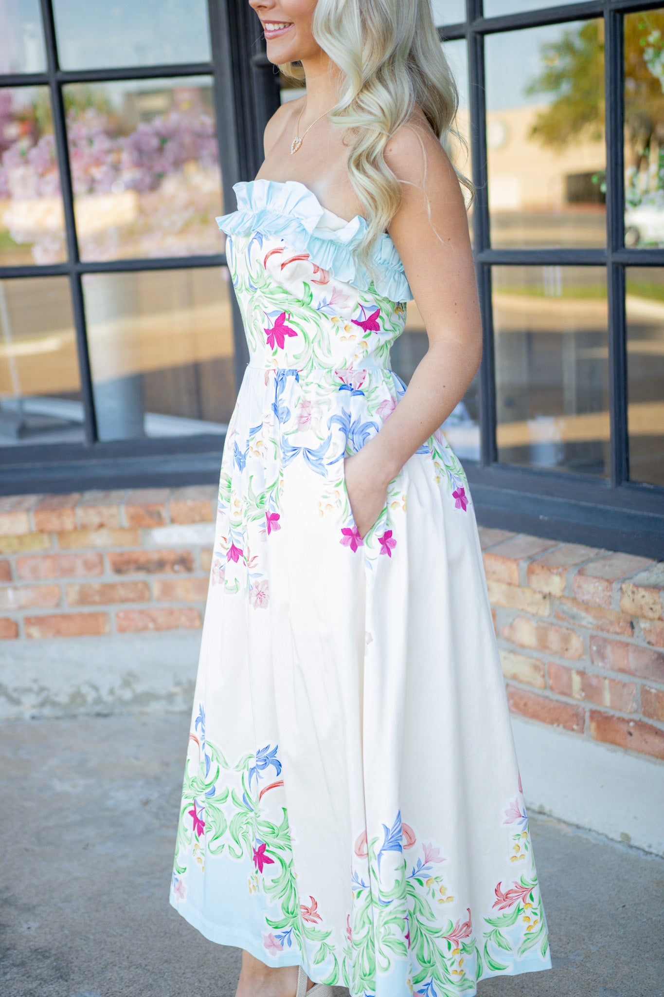 Whether it's a wedding or a weekend getaway, the Catherine Dress in Chateau is the perfect choice, keeping you comfortable and cool while looking oh so cute! This strapless dress features a ruffle bodice detail and midi length.