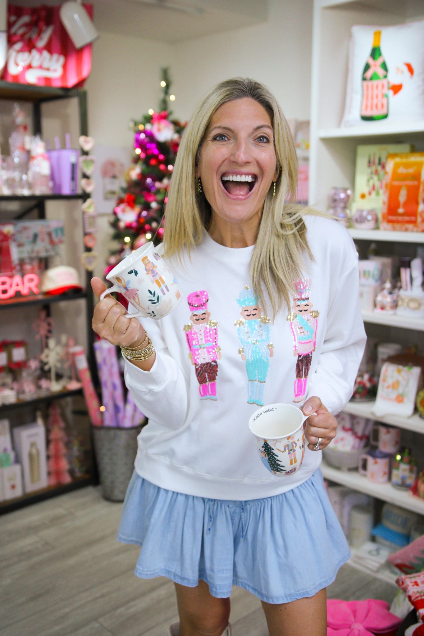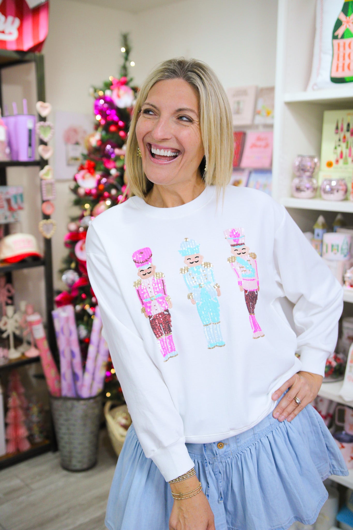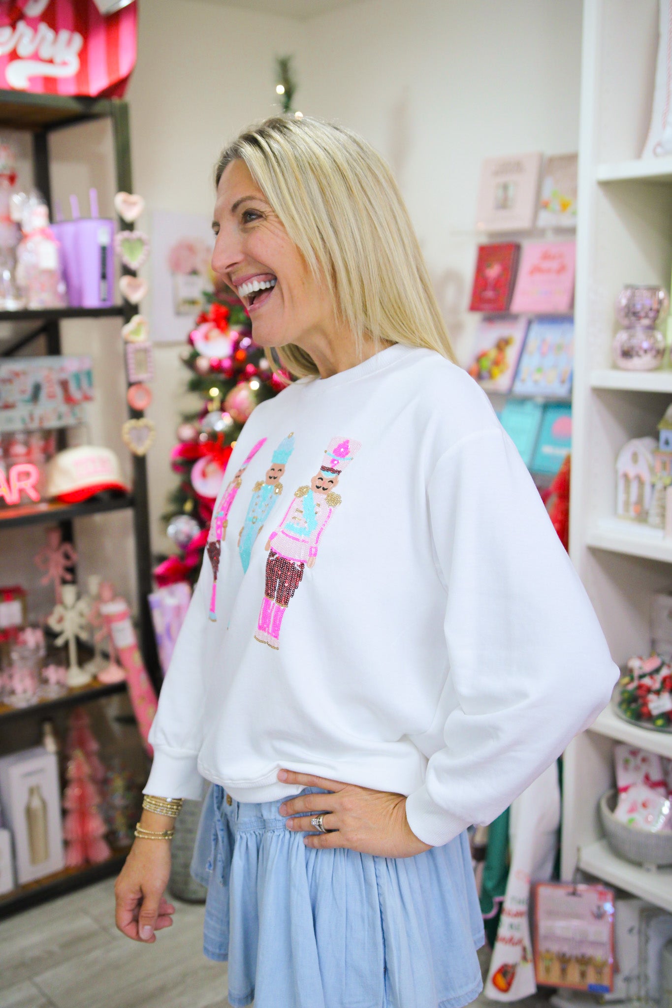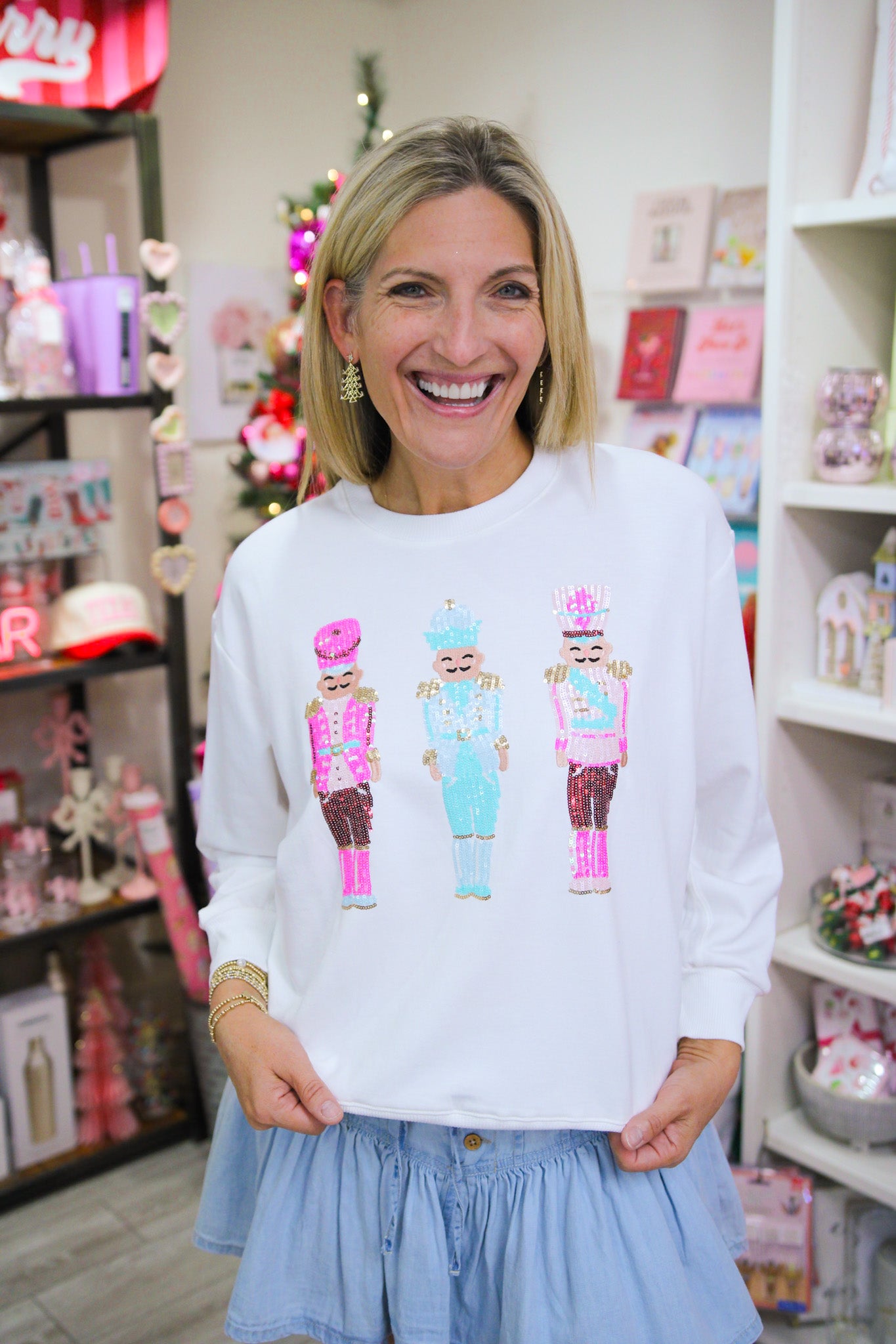 Celebrate the holiday spirit with the Three Nutcrackers Sarah Sweatshirt. This soft white sweatshirt features playful sequin nutcracker designs that bring a touch of festive magic to your look. With cozy long sleeves, it’s perfect for chilly Christmas days or fun holiday gatherings, making comfort and holiday cheer go hand in hand.