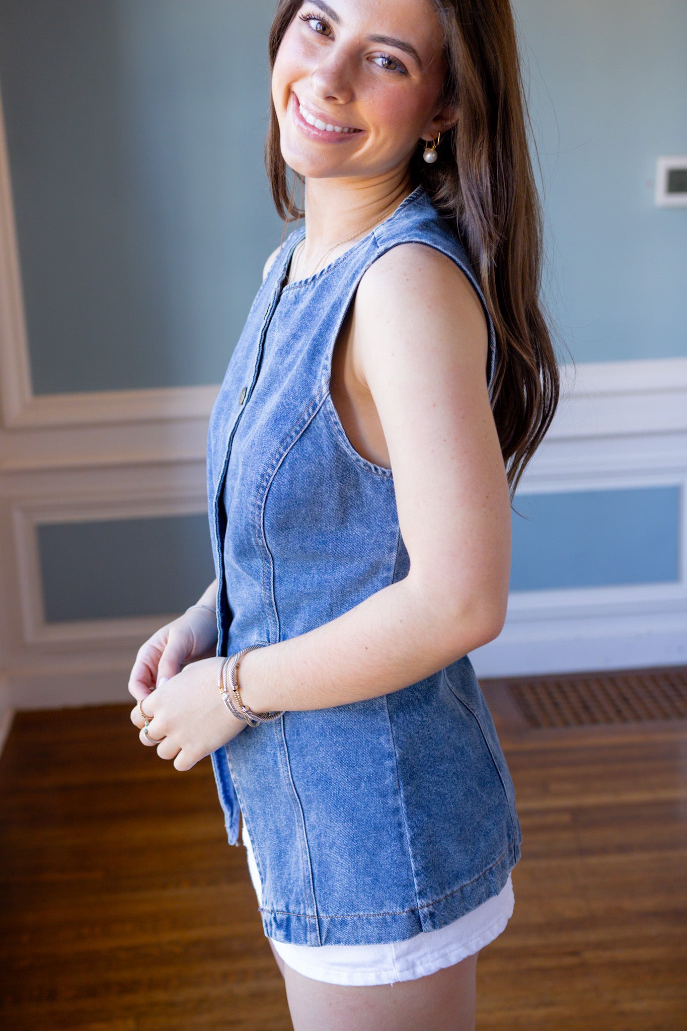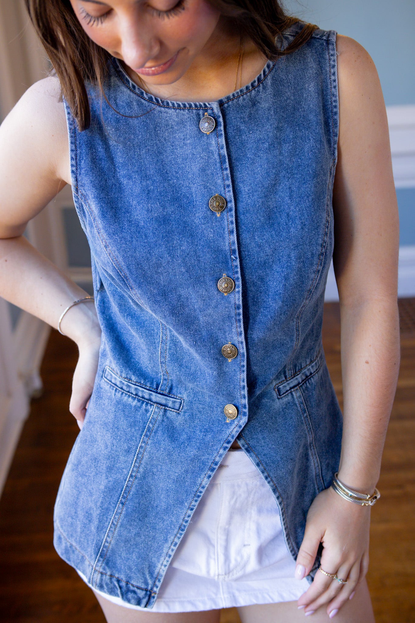 Elevate your layering game with this soft denim vest! Featuring a longer length for extra coverage and a functional button front closure that lets you customize your look. While the front pockets are just for show (we know, such a tease!). Your wardrobe's new best friend!