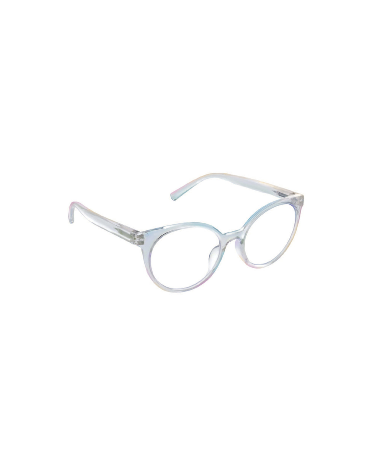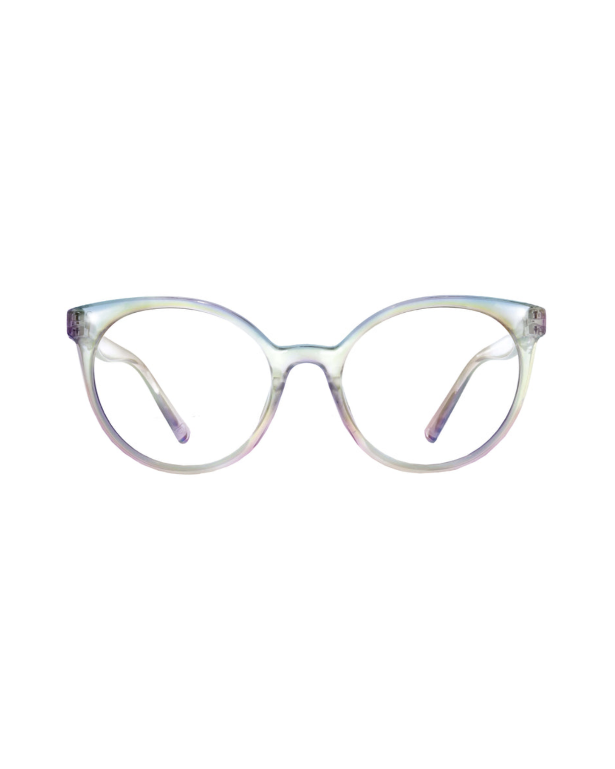 Embrace out-of-this-world style. Moonstone's alluring, iridescent coloring—in clear and smoke—will inspire you with an array of rainbow shades, depending on how the light captures it. Featuring a trend-forward, round cat eye shape, this is just the frame to capture your imagination and uplift your mood.