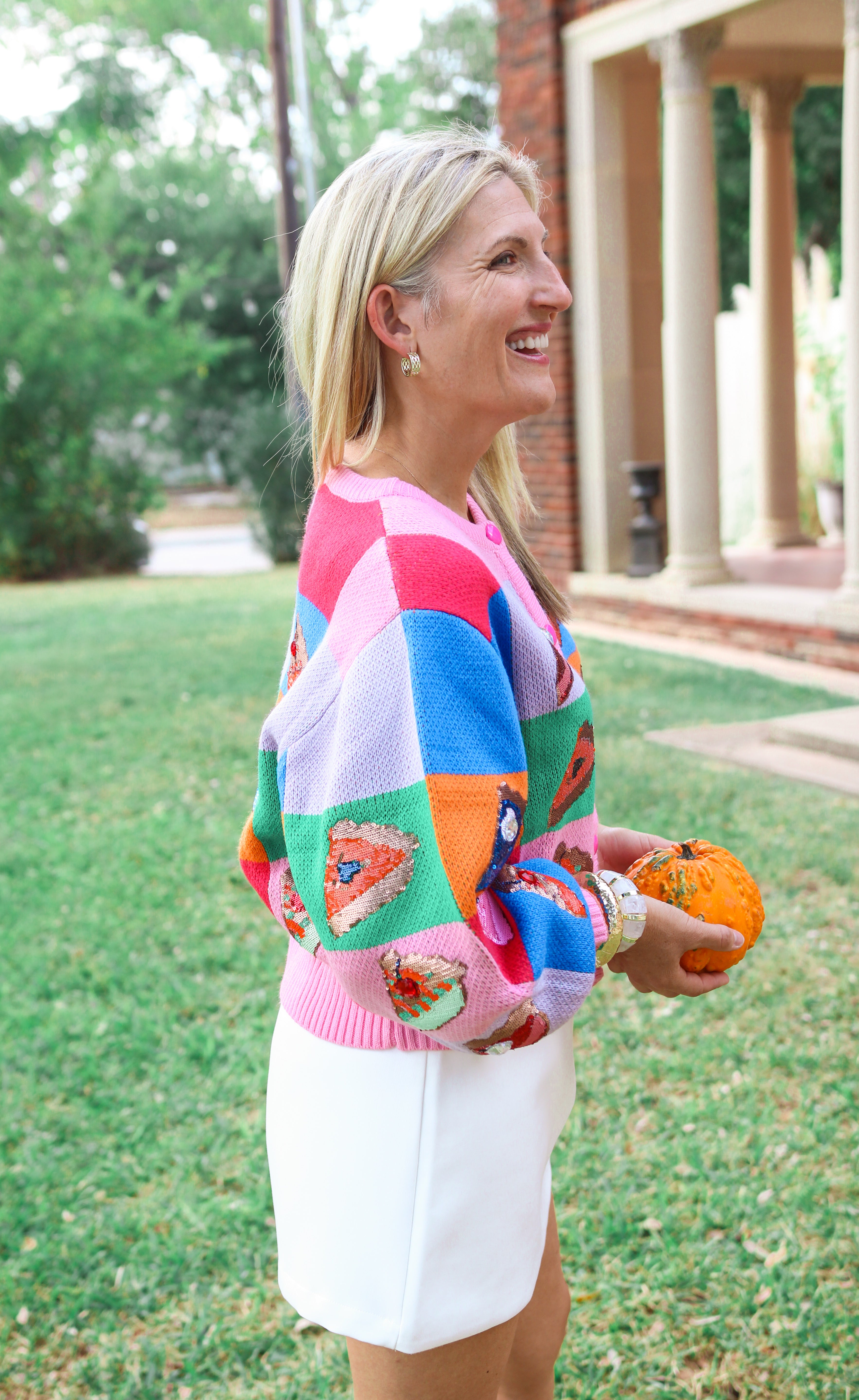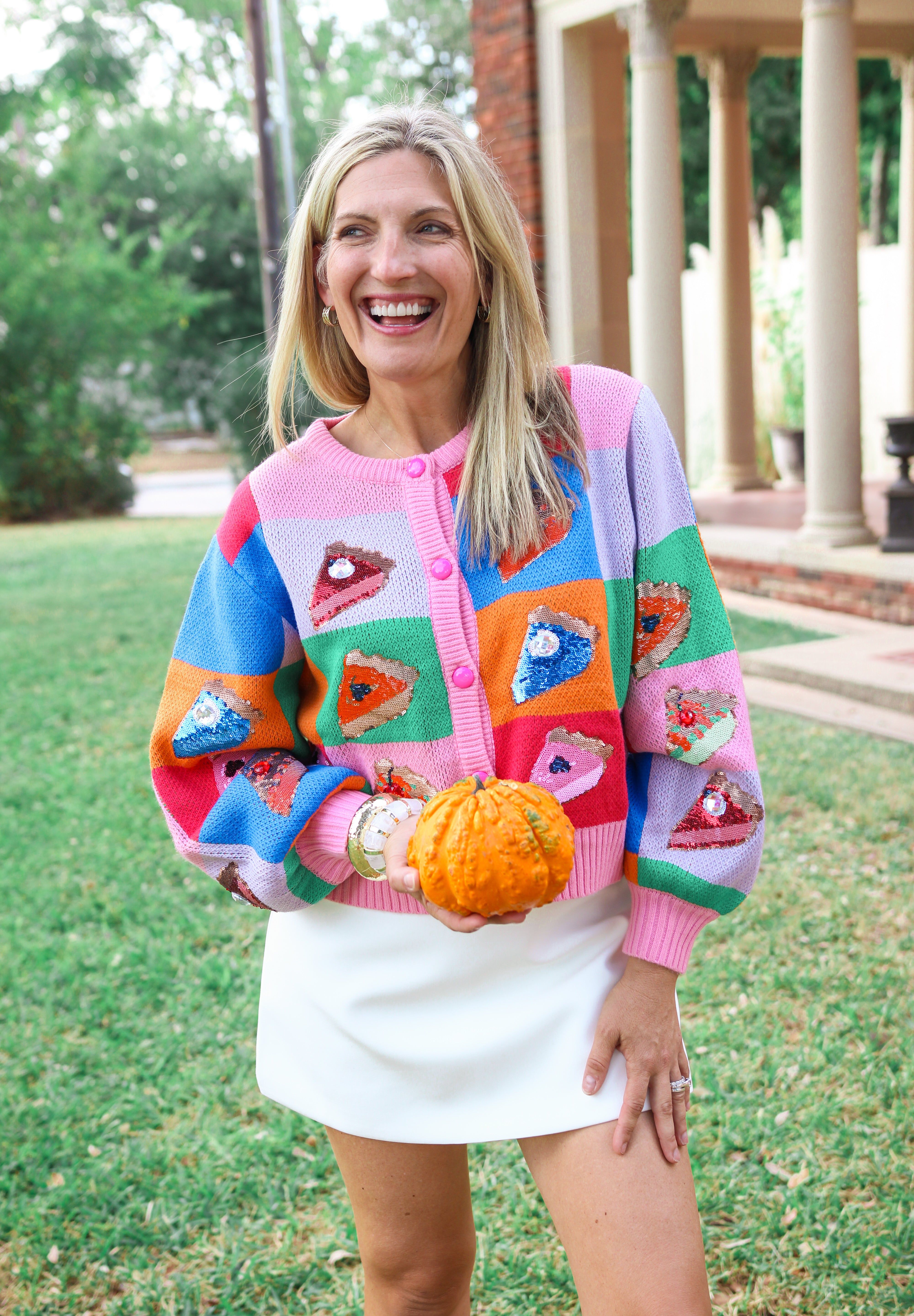 Add a splash of fun to your Thanksgiving with our Rainbow Colorblock Piece of Pie Button Up Sweater. Bright, playful colors come together like your favorite slice of pie, making this sweater as sweet and charming as the holiday itself. Perfect for cozy family gatherings or festive outings, it’s sure to bring smiles and a pop of color wherever you go. Pair with the matching skirt for the full look!