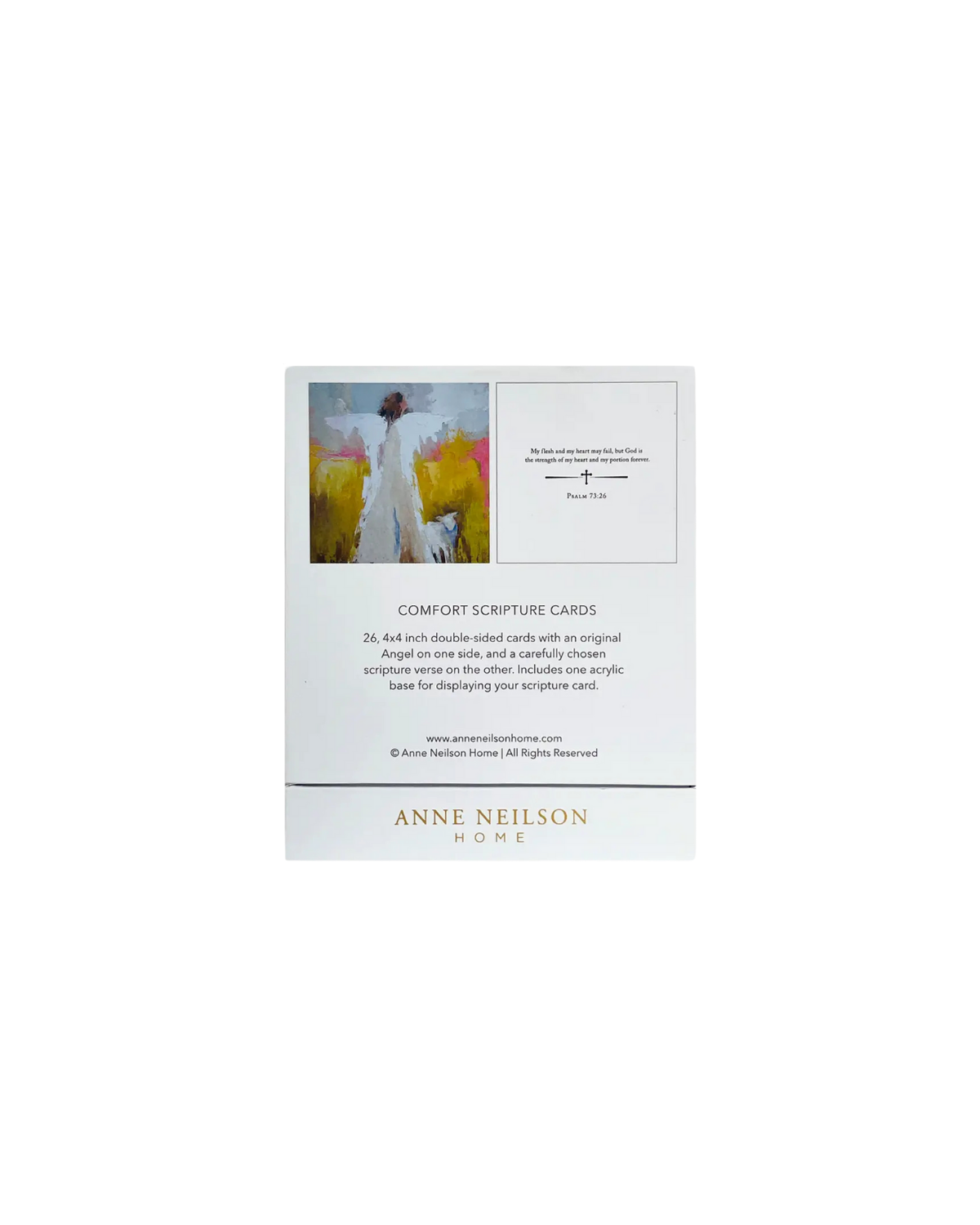 Designed to be a source of strength and comfort, Comfort Scripture Cards feature 26, 4x4 inch double-sided cards with an original Angel on one side, and a carefully chosen scripture verse on the other. Each set comes with one acrylic base for displaying the scripture cards.
