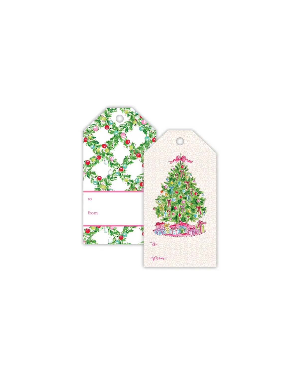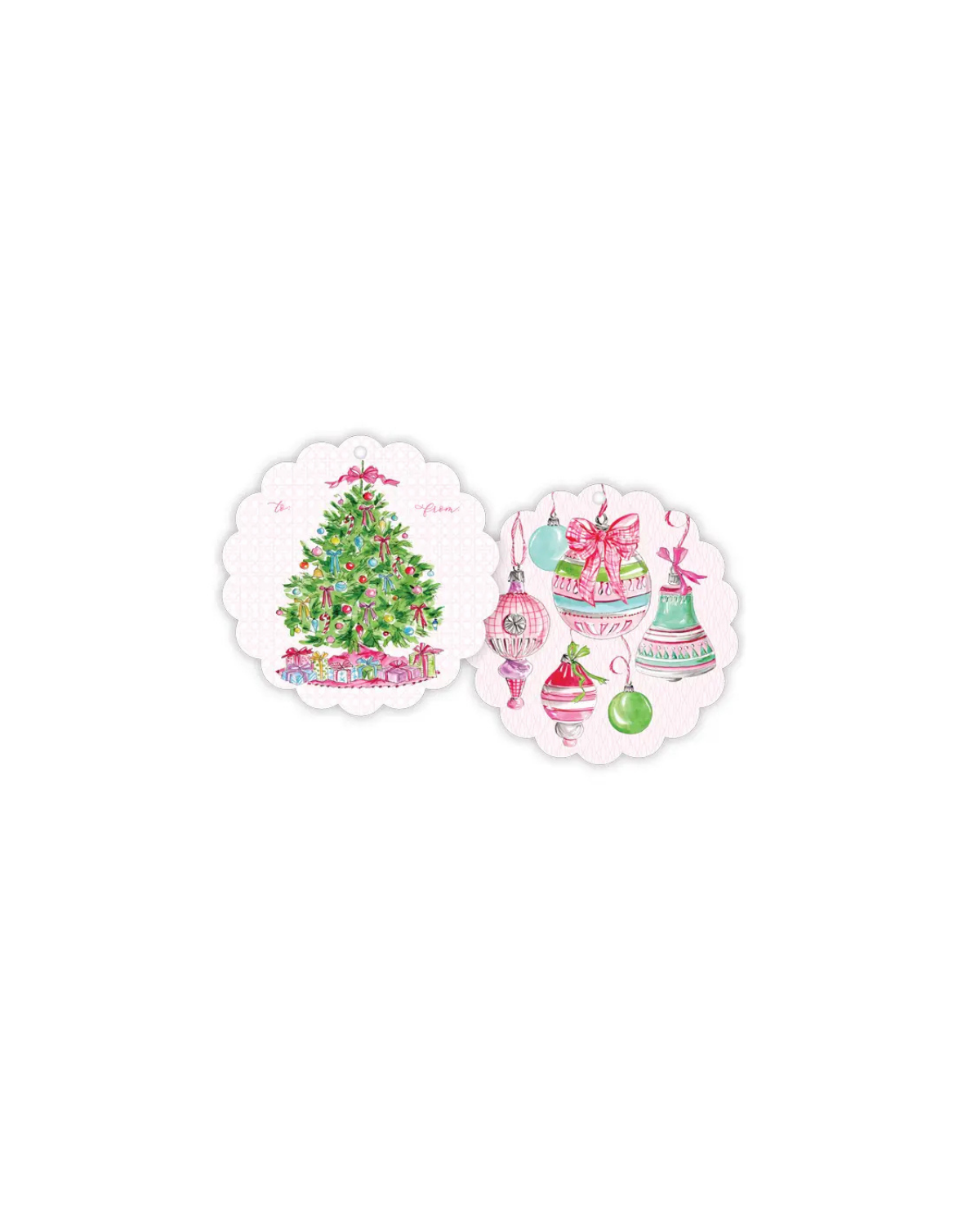 Pink Christmas Tree with Ornaments Scalloped Gift Tag Set