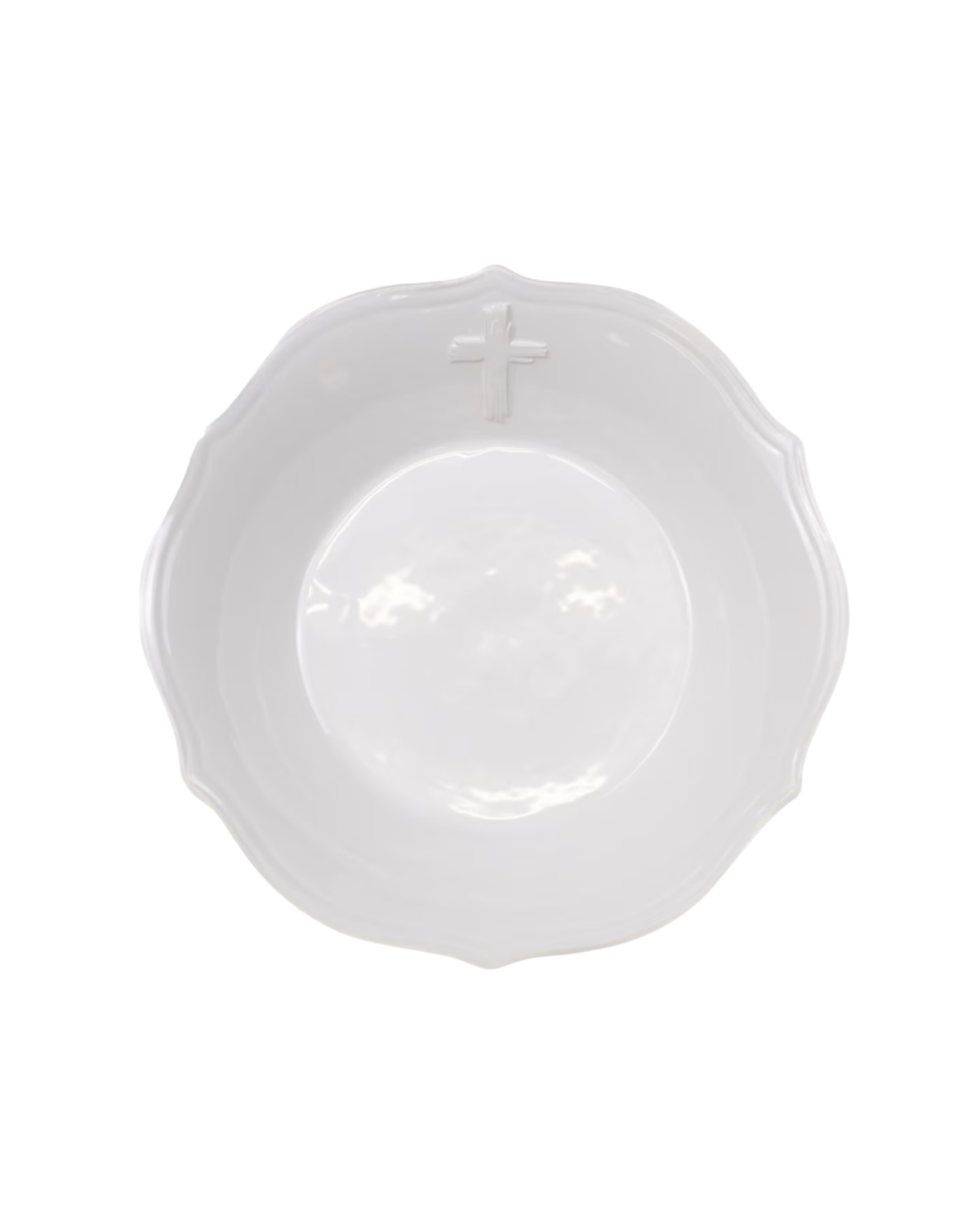 Serve up blessings with this beautiful 11" serving bowl! A graceful white embossed cross adorns the center of the bowl's top, adding a meaningful touch to your table. The scalloped edges bring classic charm and elegance, making this piece as lovely to look at as it is to use. Whether you're dishing up salads, sides, or your signature casserole at family dinners, this bowl combines faith and function in the most delightful way. Perfect for everyday meals or special occasions, it's a conversation starter that reminds everyone gathered around your table what truly matters. A little grace never looked so good!