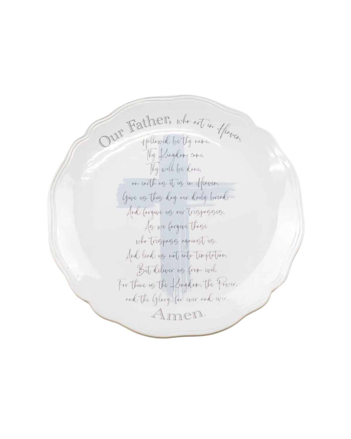 Serve up some spiritual inspiration with this charming round platter! Featuring the Lord's Prayer elegantly inscribed in gray text against a crisp white backdrop, it's both a functional piece and a meaningful conversation starter. A soft frosty blue cross peeks through behind the text, adding a touch of serene sophistication. The scalloped edges give it that classic, timeless appeal—perfect for displaying your favorite treats or hanging as a decorative reminder of faith and grace. Whether you're hosting a gathering or looking for a thoughtful gift, this platter brings a little bit of blessing to any table.