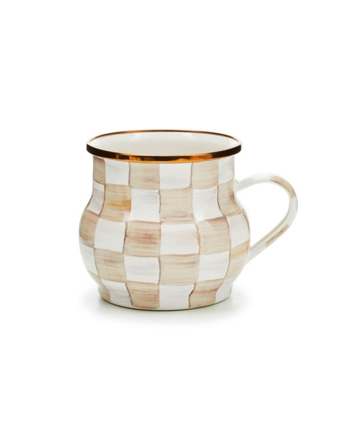 Hearty and handy, our handsome Check Enamel Mug is perfect for a draught of hot chocolate or calming tea. But don't stop there, pick up a loaf of crusty bread and a rich gruyere, and stew a batch of French onion soup in these oven-safe mugs. Pair with our Check Tea Kettle and a gourmet roast for a display-worthy gift to energize a night owl's morning routine. With glossy, hand-painted, high-contrast checks, we've yet to find a color (or food!) that it doesn't look good with.